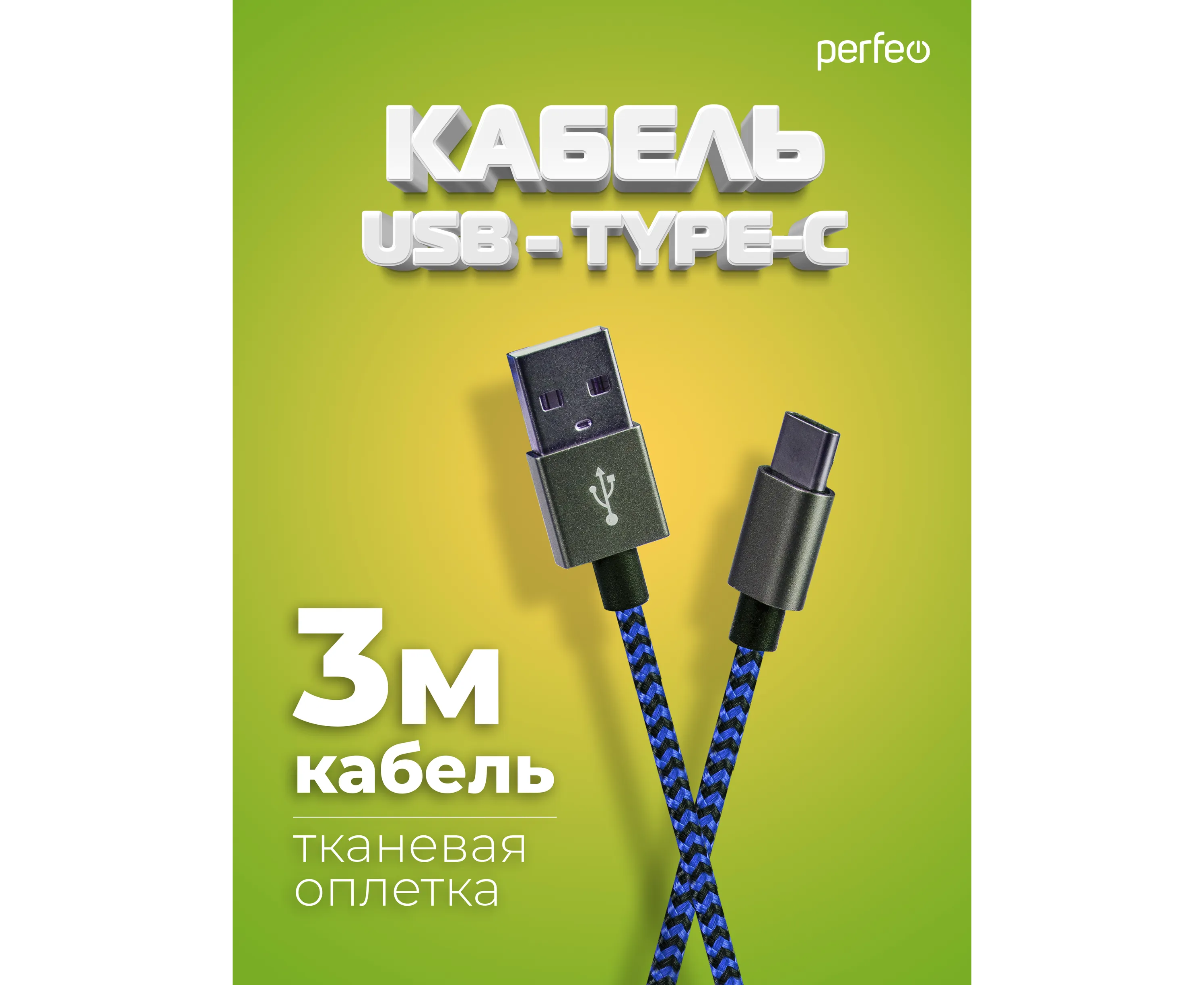 Кабель PERFEO USB A вилка - Type-C вилка, черно-синий, длина 3 м. (U4904)