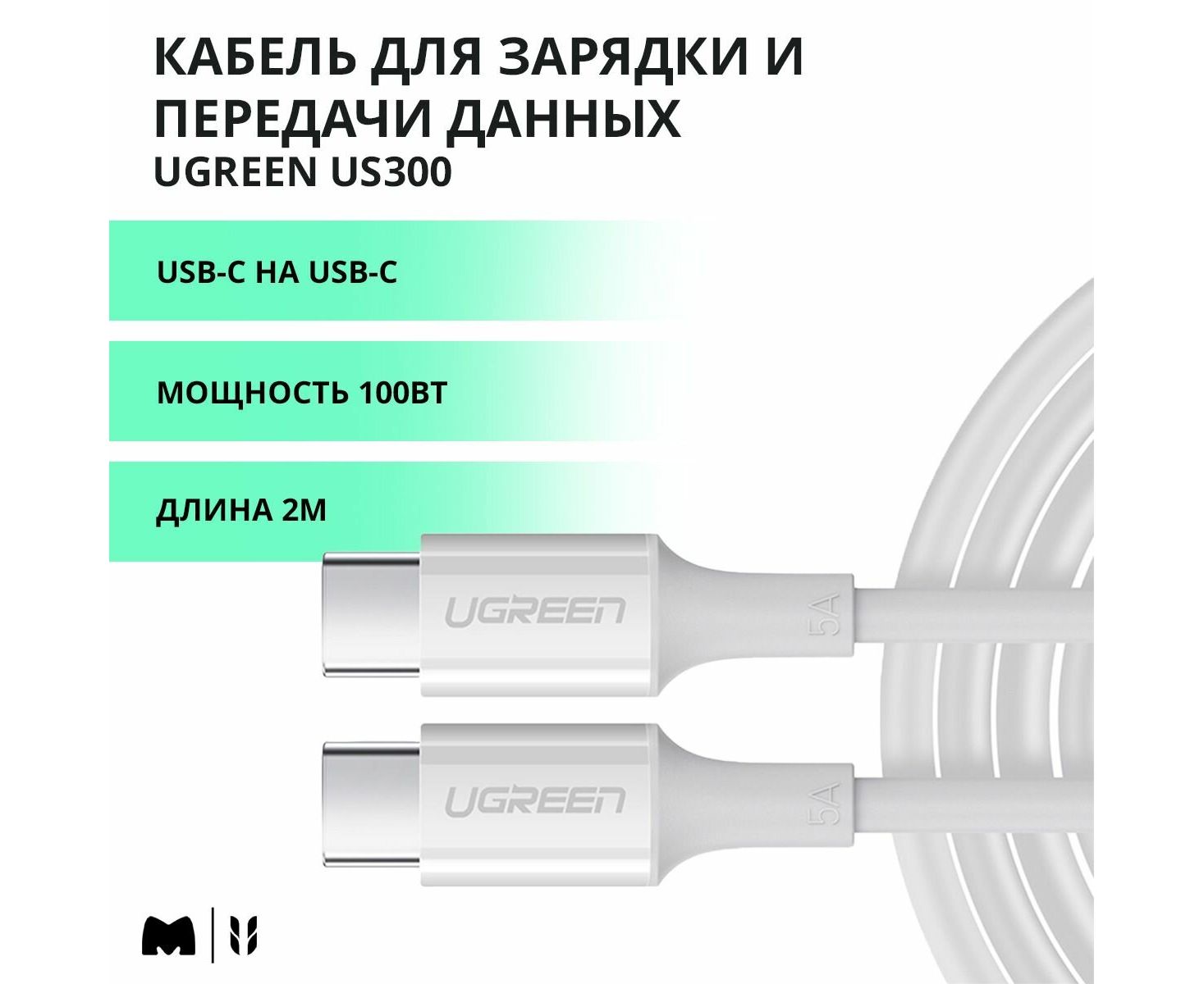 Кабель UGREEN US300 60552 Type-C Male to Type-C Male 2.0 ABS Shell 5A Current 2m White