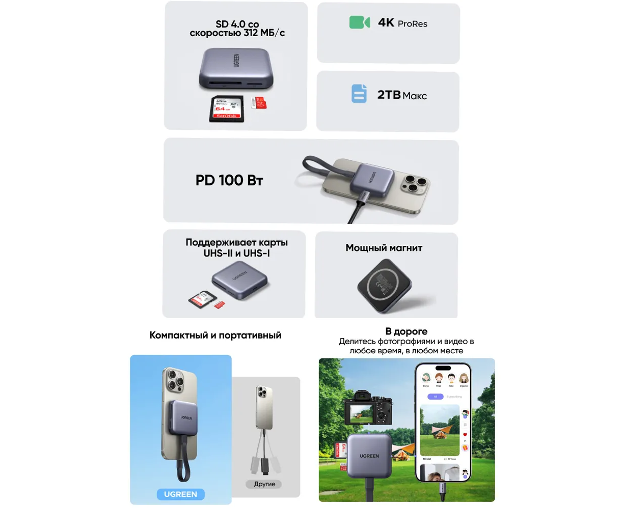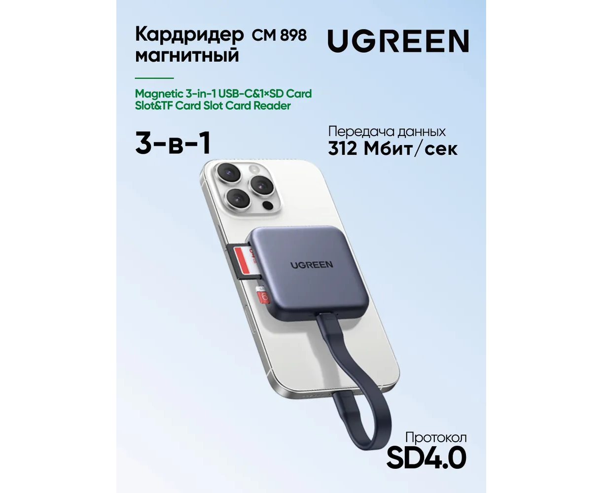 Кардридер UGREEN CM898 (65095) Magnetic 3-in-1 USB-C 1×SD Card Slot TF Card Slot Card Reader серый космос
