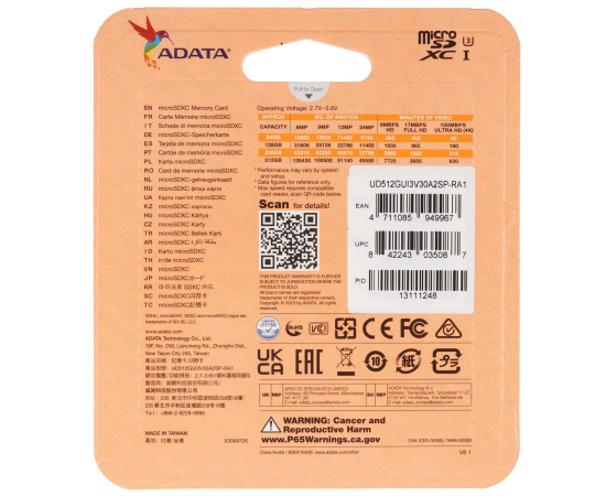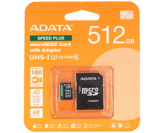 Карта памяти A-DATA UD512GUI3V30A2SP-RA1 microSD 512GB Speed Plus microSDXC Class 10 UHS-I U3 V30S A2 180/160 MB/s (SD адаптер)