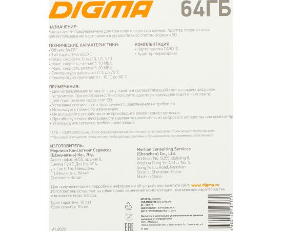 Карта памяти Digma Card10 (DGFCA064A01) microSDXC 64Gb Class10 + adapter