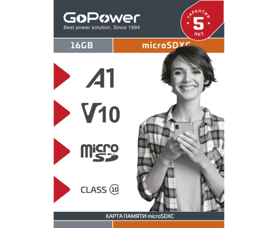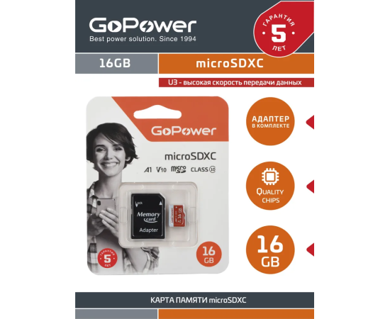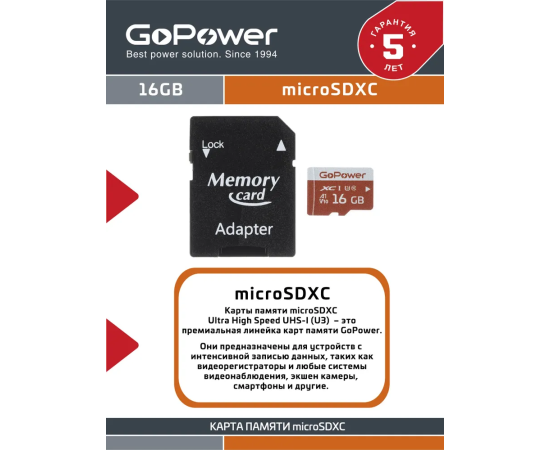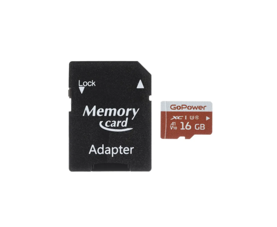 Карта памяти GoPower 00-00025678 microSD 16GB Class10 UHS-I (U3) 80 МБ/сек V10 с адаптером