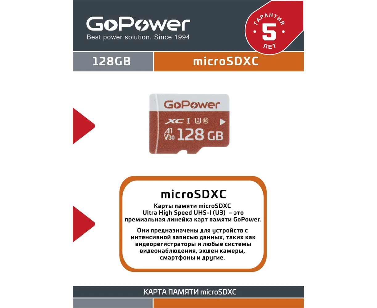 Карта памяти GoPower 00-00025683 microSD 128GB Class10 UHS-I (U3) 100 МБ/сек V30 без адаптера