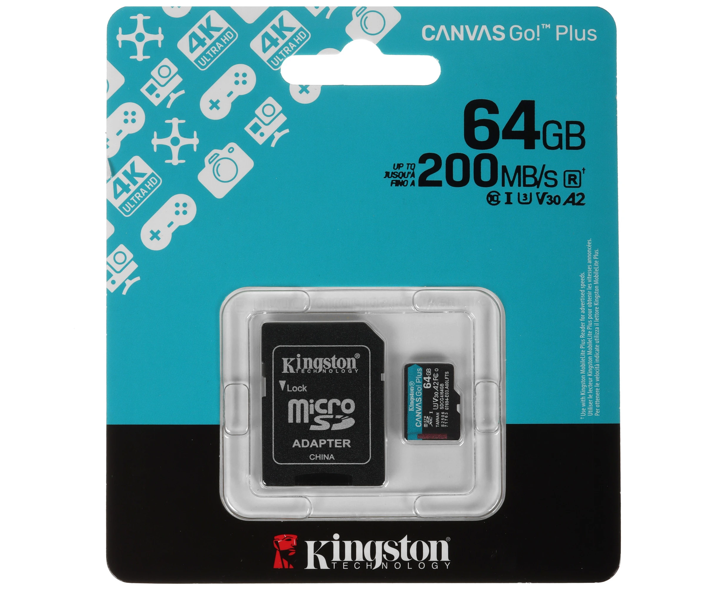 Карта памяти Kingston Canvas Go! Plus microSDXC 64 ГБ [SDCG4/64GB] рассчитана на эксплуатацию при температуре от -25 до 85 °C. В комплекте есть адаптер на SD. Максимальная скорость чтения и максимальная скорость записи равны 200 МБ/с.