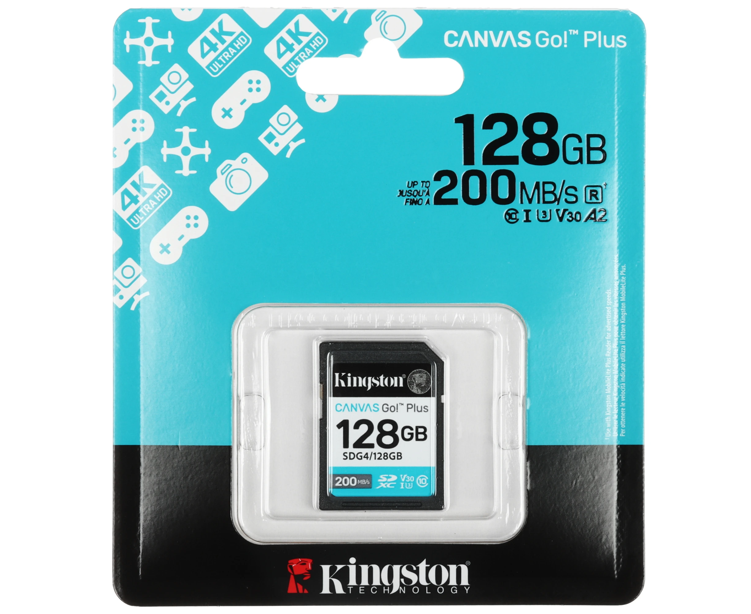 Карта памяти Kingston Canvas Go! Plus SDXC 128 ГБ [SDG4/128GB] соответствует классам скорости Class 10, UHS Class 3 и Video Class 30. Изделие предназначено для фотокамер и других устройств.