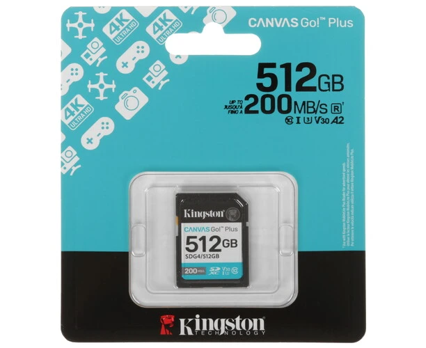 Карта памяти Kingston Canvas Go! Plus SDXC 512 ГБ [SDG4/512GB] соответствует классам скорости Class 10, UHS Class 3 и Video Class 30. Изделие предназначено для фотокамер и других устройств.
