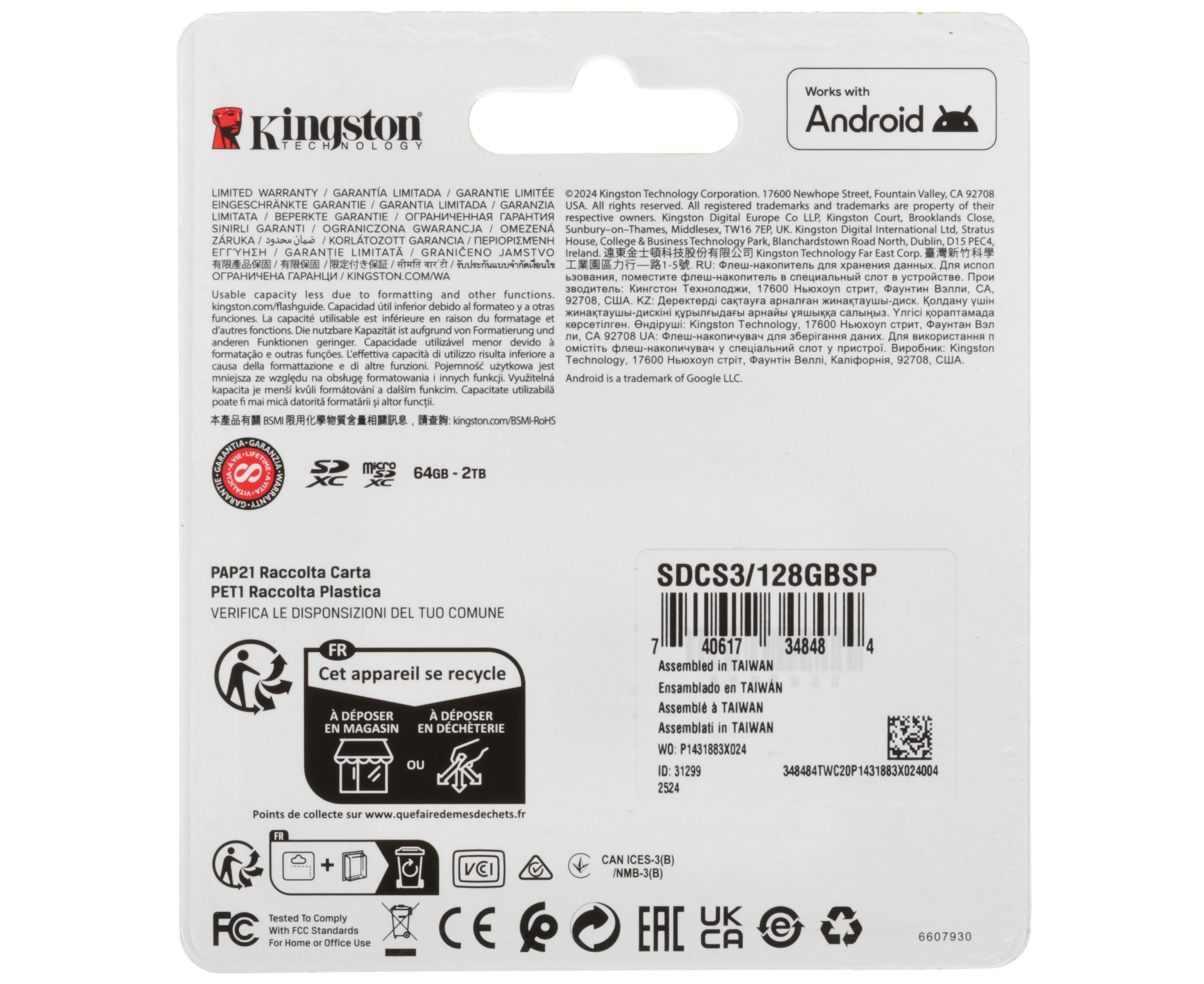 Карта памяти Kingston microSDXC 128 ГБ [SDCS3/128GBSP] соответствует классам скорости A1, UHS Class 1 и Video Class 10. Изделие предназначено для смартфонов, фотокамер и других устройств.