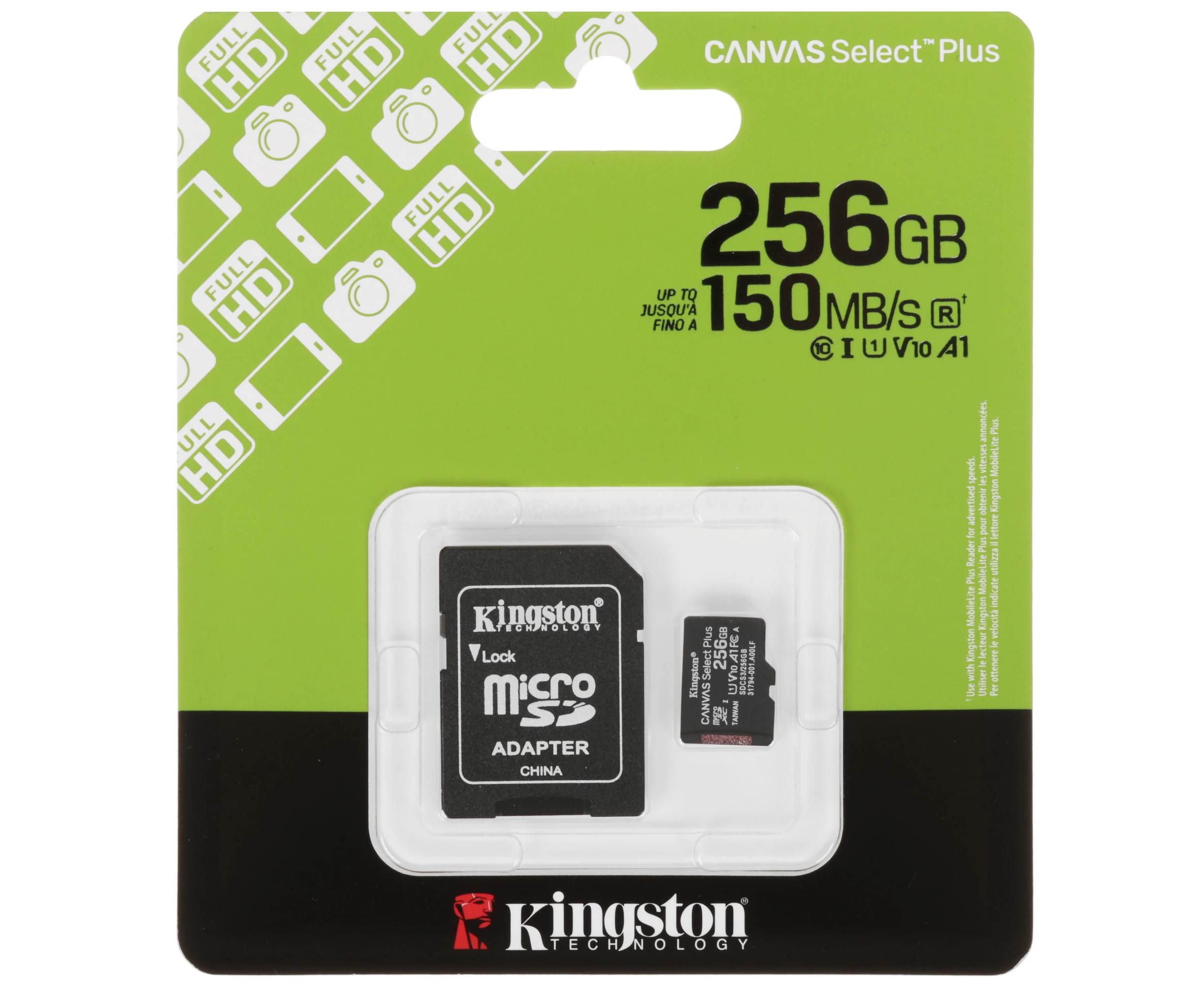 Карта памяти Kingston microSDXC 256 ГБ [SDCS3/256GB] соответствует классам скорости A1, UHS Class 1 и Video Class 10. Изделие предназначено для смартфонов, фотокамер и других устройств.