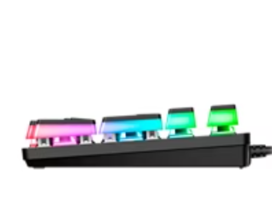 Механическая клавиатура с негромкими красными свичами.Широкие откидные ножки. Резиновые накладки. Клавиатура типа скелетон с матовыми подсвечивающимися кейкапами (RGB подсветка). Регулируемая подсветка. Компактное расположение клавиш. Металлическая верхняя панель