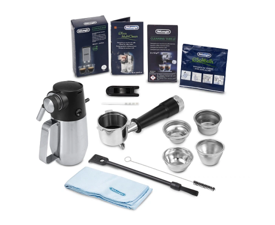 Кувшин для приготовления латте-крема (питчер+насадка для вспенивания молока LatteCrema Hot ), портафильтр, корзины для портафильтра (4 шт.), средство для удаления накипи, ёршик для очищения отверстий, игла для очистки парового отверстия, салфетка из микрофибры, полоска для определения жесткости воды