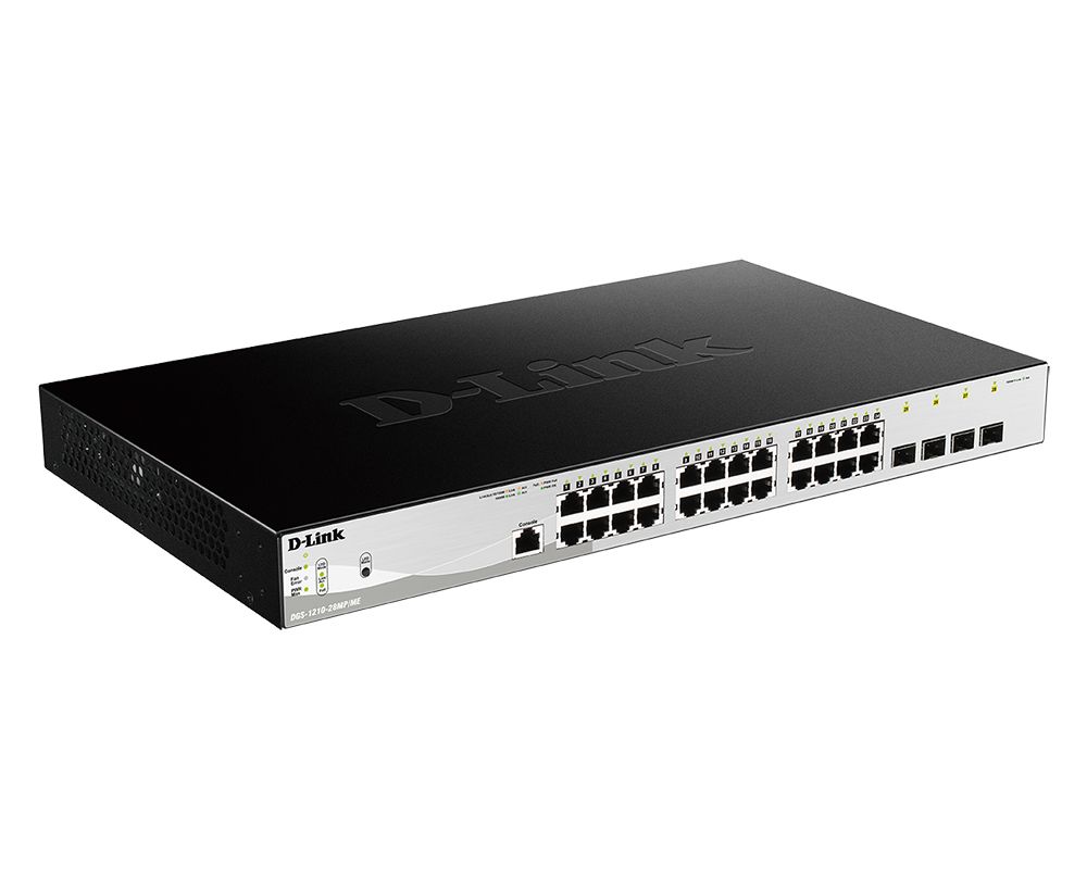 D-Link DGS-1210-28MP/ME/B1A Управляемый коммутатор 2 уровня с 24 портами 10/100/1000Base-T и 4 портами 1000Base-X SFP (24 порта с поддержкой PoE 802.3af/802.3at (30 Вт), PoE-бюджет 370 Вт)