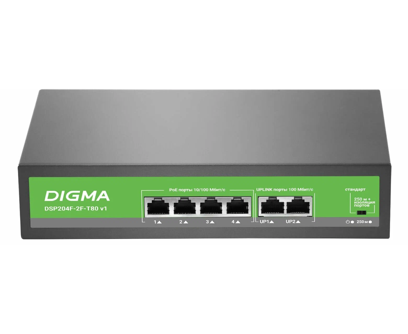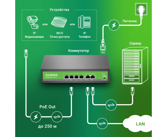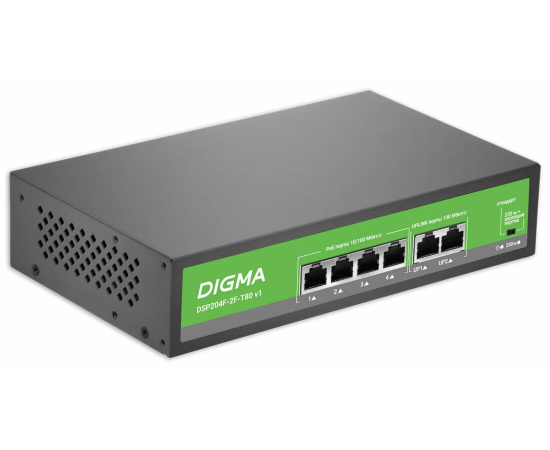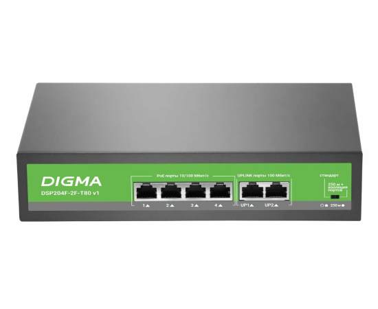 Коммутатор неуправляемый Digma DSP204F-2F-T80 V1 (L2) 6x100Мбит/с 4PoE 4PoE+ 80W