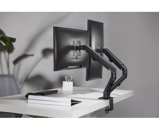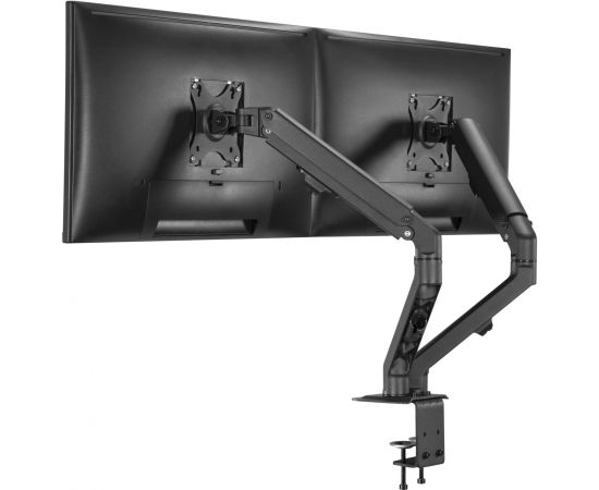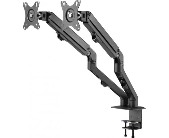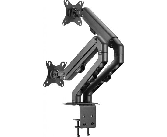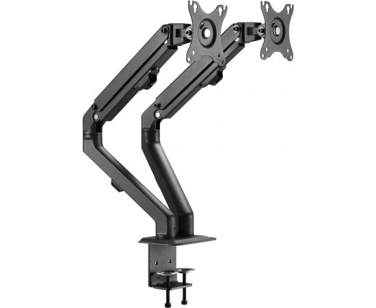 Настольный кронштейн с двумя креплениями под мониторы. Пружинный механизм позволяет легко перемещаться вверх и вниз.