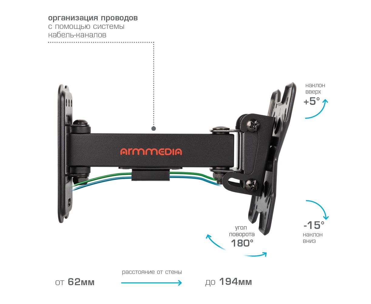 Надежная стальная конструкция, Универсальный - телевизор на кронштейне можно наклонить, повернуть и сдвинуть к стене, Легкий монтаж телевизора - благодаря наличию съемной монтажной пластины, Кабель-канал, Вращение экрана +5° -90°