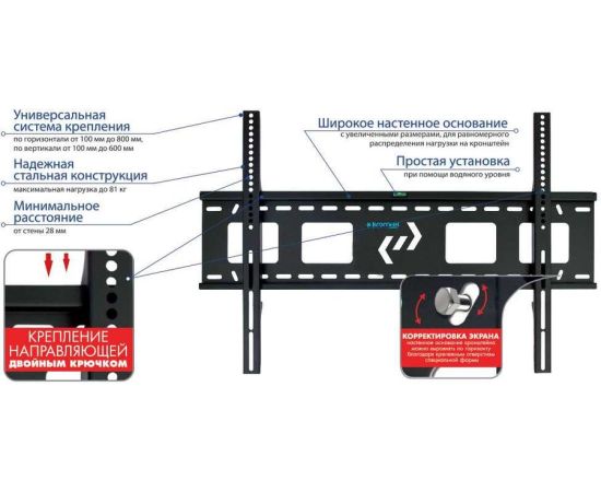 Описание Универсальная система крепления. Широкое настенное основание с увеличенными размерами для равномерного распределения нагрузки на кронштейн. Простая установка при помощи водяного уровня. Настенное основание можно выровнять по горизонту благодаря крепежным отверстиям специальной формы.
