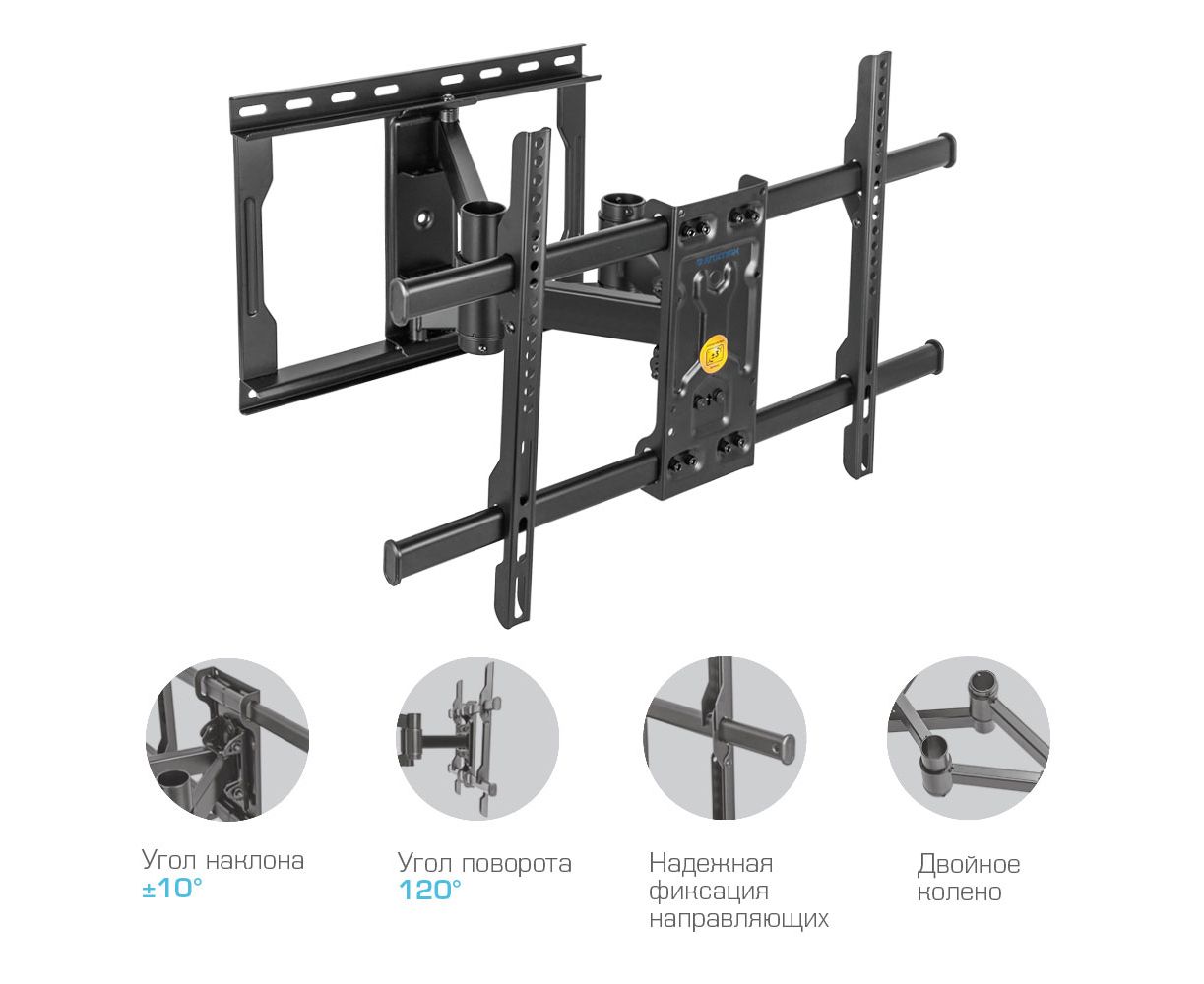 Надежная стальная конструкция максимальная нагрузка до 50 кг, Легкий монтаж при помощи съемной монтажной платформы, Универсальный - телевизор на кронштейне можно наклонить, повернуть и сдвинуть к стене , Корректировка экрана уникальная возможность вращения экрана на ±3° относительно стены