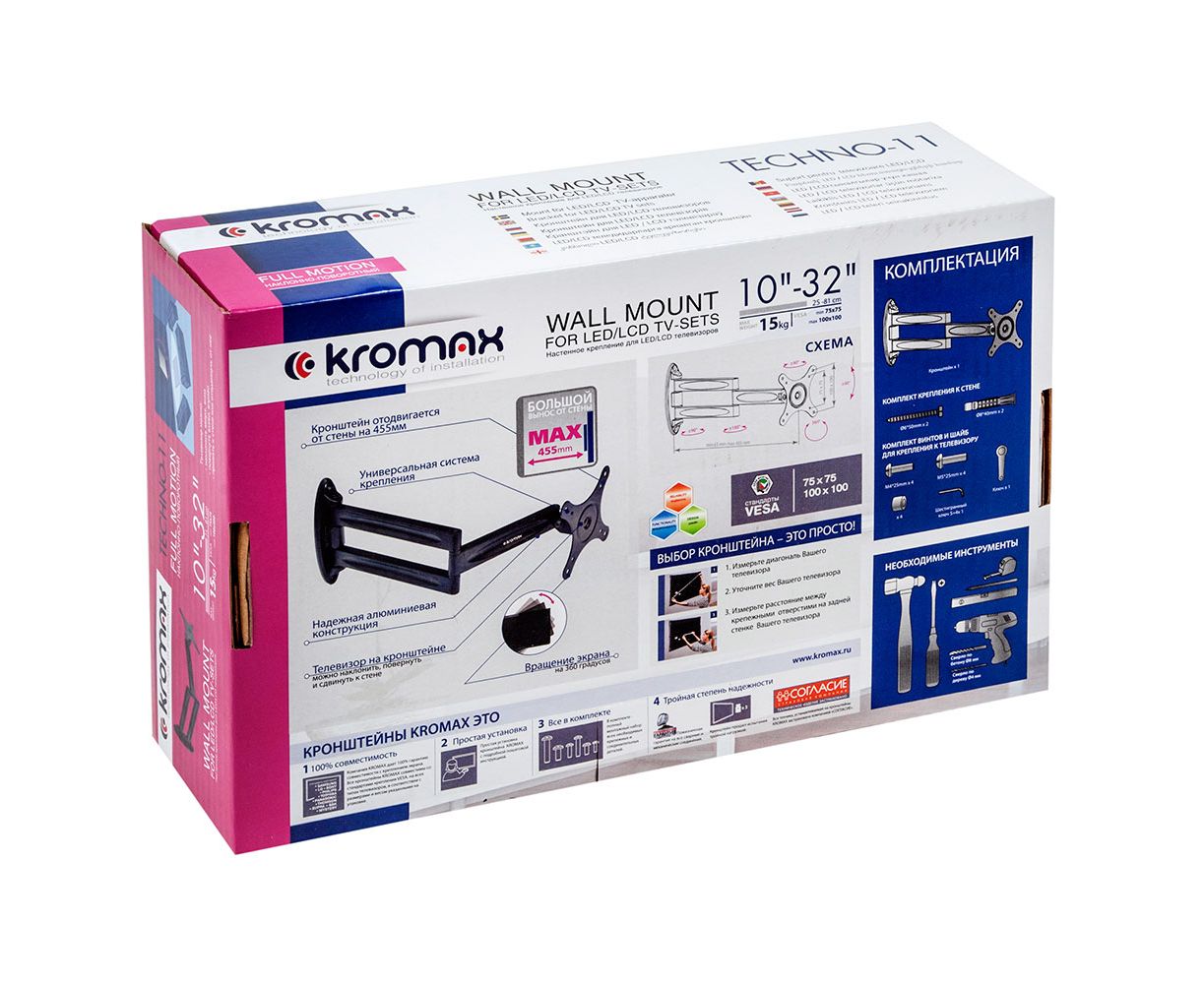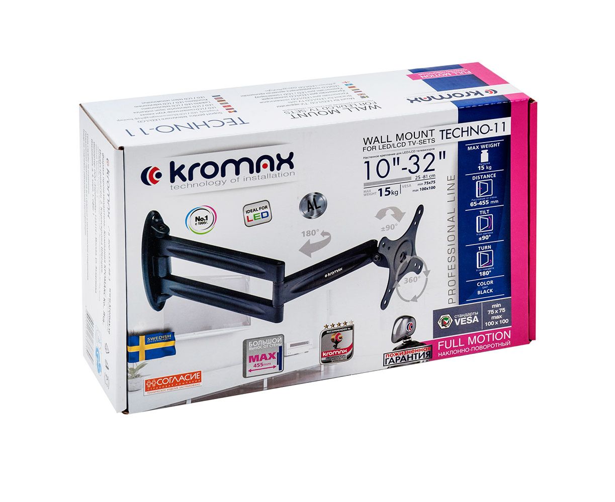 10"-32" Кронштейн Kromax TECHNO-11 Наклонно-поворотный черный макс.15кг
