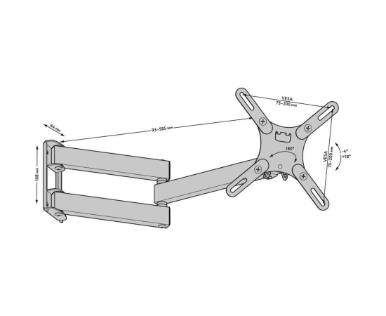 Регулировка Мин. расстояние от стены, мм 93 Макс. расстояние от стены, мм 93 Макс. угол поворота (swivel) 180° Макс. угол наклона вниз 18° Основные Мин. диагональ экрана, дюймы 22 Макс. диагональ экрана, дюймы 42 Максимальная нагрузка, кг 30 Регулировка крепления Наклон, Поворот Место крепления На стену Совместимость Стандарт крепления VESA 100x100 мм, 200x200 мм, 75x75 мм, 200x100 мм