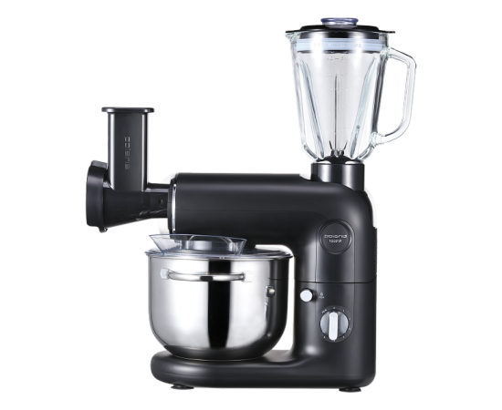 венчик для взбивания, крюк для замешивания теста, насадка для смешивания, мясорубка с 3 дисками из нержавеющей стали (3, 5 и 7 мм), насадка для кеббе насадка для колбас блендер (1,5 л) овощерезка 4 барабана (крупная терка, мелкая терка, терка для шинкования, терка для драников)