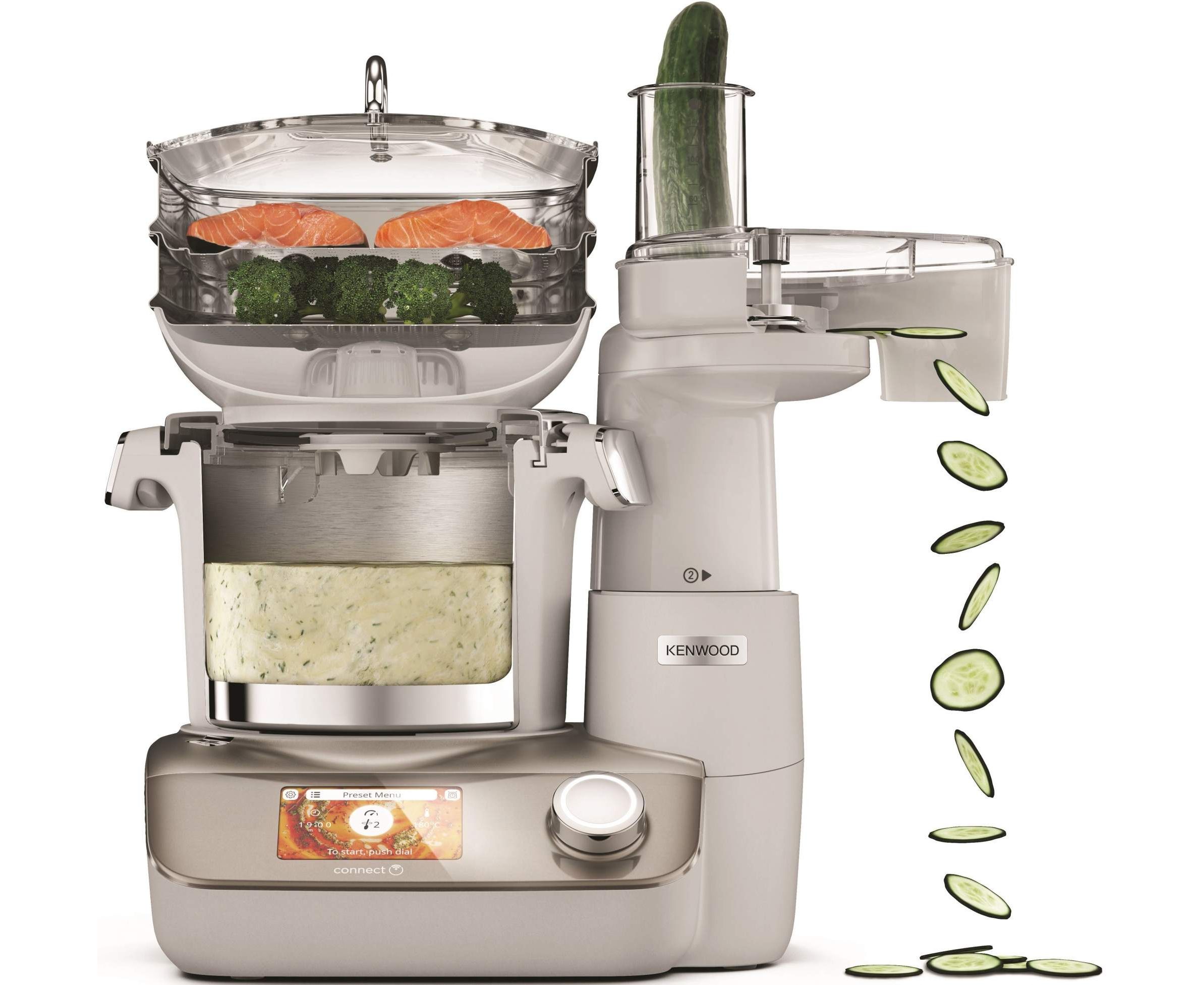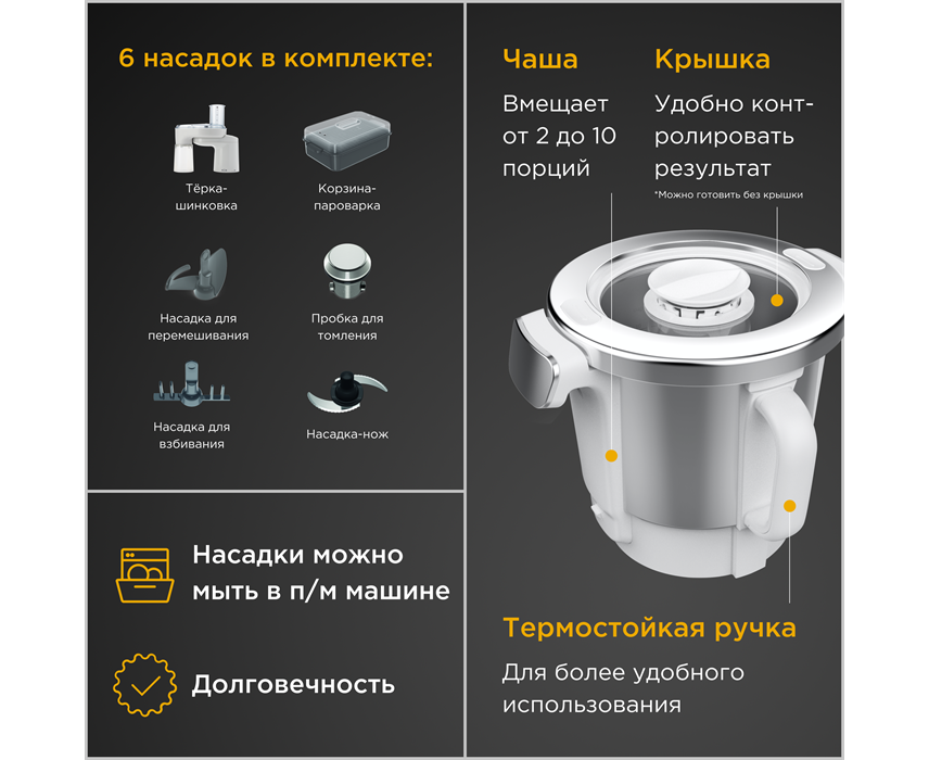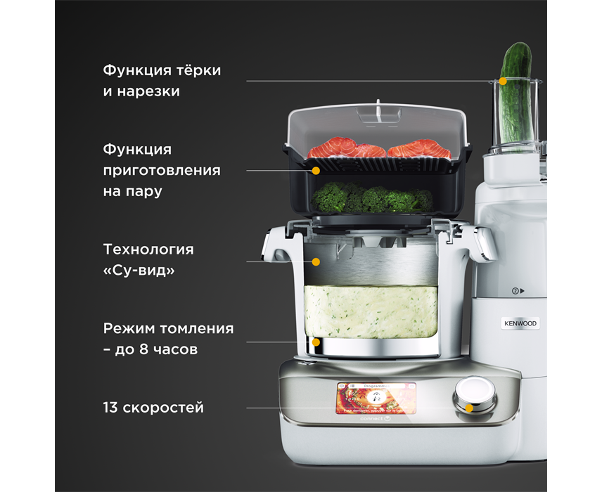 Тип кухонный комбайн Потребляемая мощность, в Вт 1500 Тип управления сенсорный Объем чаши, в литрах 4.5 Материал чаши металл Блендер Нет Количество насадок 4 Насадки диск для шинковки; насадка для смешивания; универсальный нож Индикация включения Защита от перегрузки Управление Количество скоростей 12 Корпус Цвет серебристый Материал пластик Комплектация Комплект поставки корзина-пароварка; венчик; чаша для взвешивания; лопасть для перемешивания; лопатка; насадка для медленного приготовления; насадка фуд-процессор; измельчительный нож; диск для грубой нарезки; диск для тонкой нарезки; диск для грубой шинковки; диск для мелкой шинковки; диск для сверхтонкой шинковки Размеры и вес Высота, в см 48 Ширина, в см 35 Глубина, в см 30