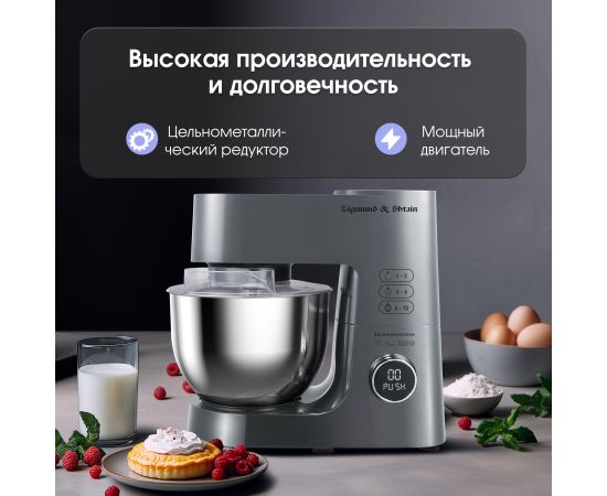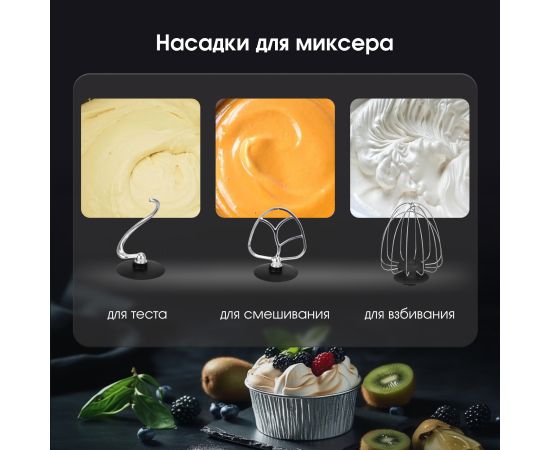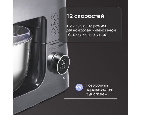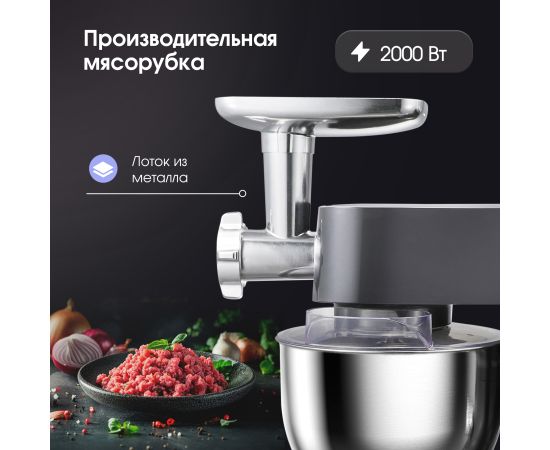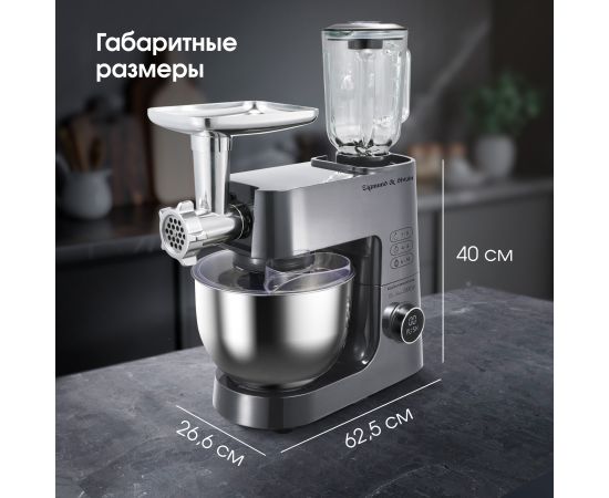 Тип кухонная машина Мощность, Вт 2000 Цвет серебристый Объем чаши, л 7 Количество скоростей 12 Тип двигателя АС с усиленной медной обмоткой Система смешивания планетарная Импульсный режим (турбо) есть Число насадок, шт 12 Материал корпуса ABS-пластик Материал чаши нержавеющая сталь Плавный запуск двигателя есть Пониженный уровень шума есть Автоотключение при перегреве есть Автоблокировка при поднятом откидном блоке есть Мясорубка есть Блендер есть Лоток мясорубки есть Конструктивные особенности увеличенная чаша, цифровое управление, поворотный переключатель с дисплеем, крышка с отверстием для добавления ингредиентов во время работы, прорезиненные фиксирующие ножки для дополнительной устойчивости Функциональные особенности 3 в 1 : миксер, блендер, мясорубка, функция колки льда, пониженный уровень шума Комплектация корпус с электродвигателем, чаша стальная, крышка чаши, насадка-венчик для взбивания, насадка для смешивания, насадка для замешивания теста, насадка-блендер, насадка мясорубка (корпус мясорубки, лоток для подачи продуктов, шнек, крестообразный нож, фиксирующая гайка, дисковая решетка - 3 шт, разделительная насадка для кэббе, насадка для кэббе, насадка для колбас, толкатель), инструкция, гарантийный талон Длина сетевого шнура, м 1 Размеры, см 26,6x62,5x40 Вес (нетто/брутто), кг 8,43/9,67