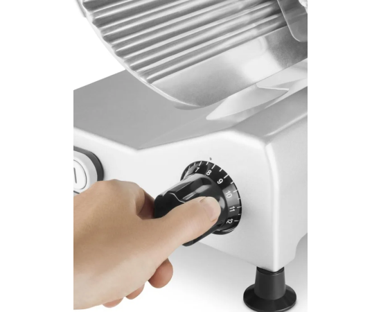 Прочный металлический корпус слайсера и регулируемые нескользящие ножки гарантируют исключительную устойчивость даже при нарезке самых твердых продуктов.