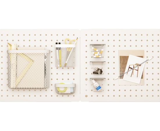 Набор аксессуаров CS-PB-SET1 станет идеальным дополнением к перфорированному органайзеру Cactus. Сетчатые корзины разных размеров, закрывающиеся пластиковые контейнеры для различных мелочей и держатель для заметок – для сохранения порядка на рабочем месте в офисе или дома. Аксессуары легко и надёжно крепятся к панели, имеют универсальный белый цвет, который органично впишется в интерьер.