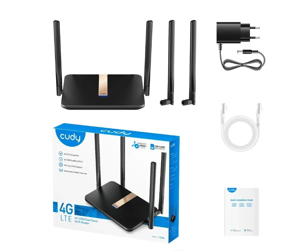 4G LTE WiFi роутер, адаптер питания, RJ45 Ethernet кабель, руководство быстрой установки