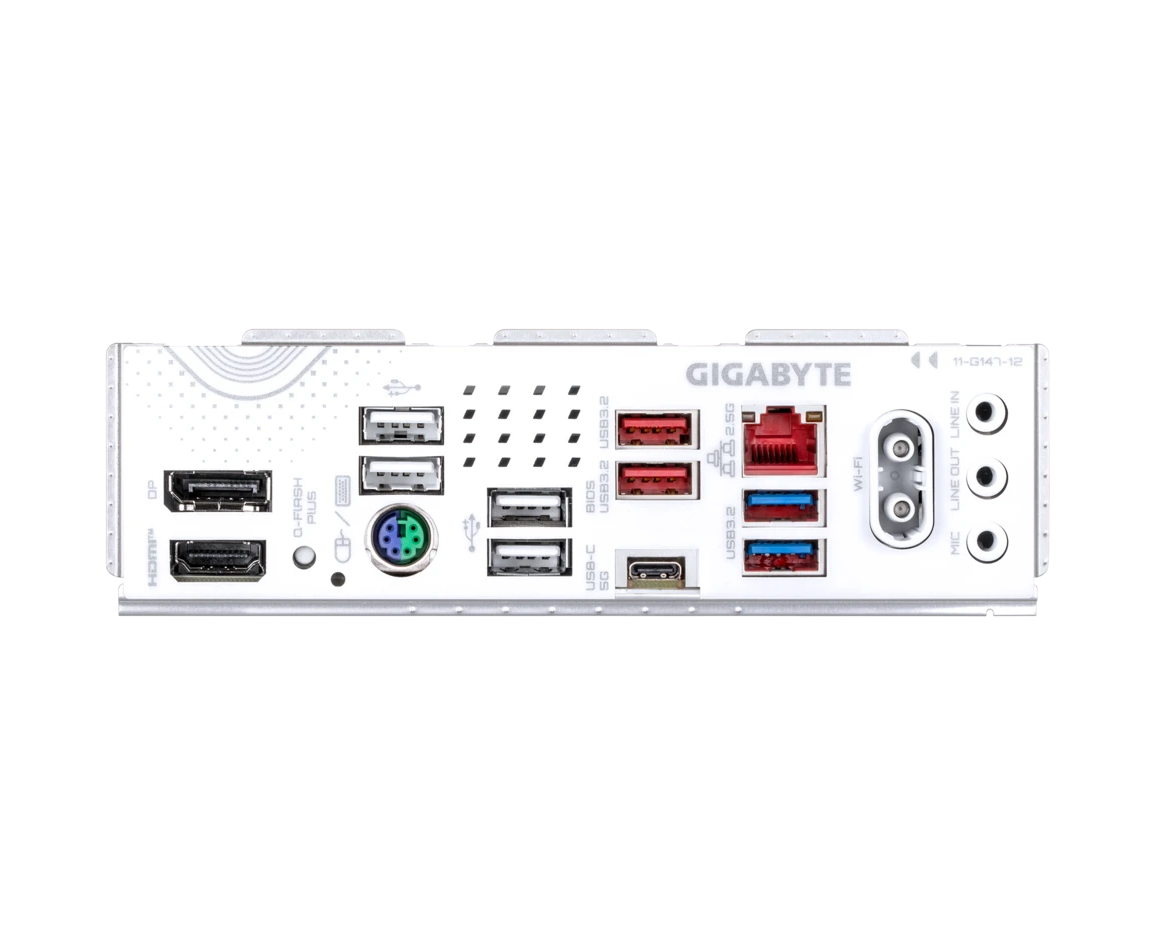 PS/2, 4 x USB 2.0, 2 x USB 3.2 Gen1, USB 3.2 Gen1 Type-C, 2 x USB 3.2 Gen2, HDMI, DisplayPort, RJ-45