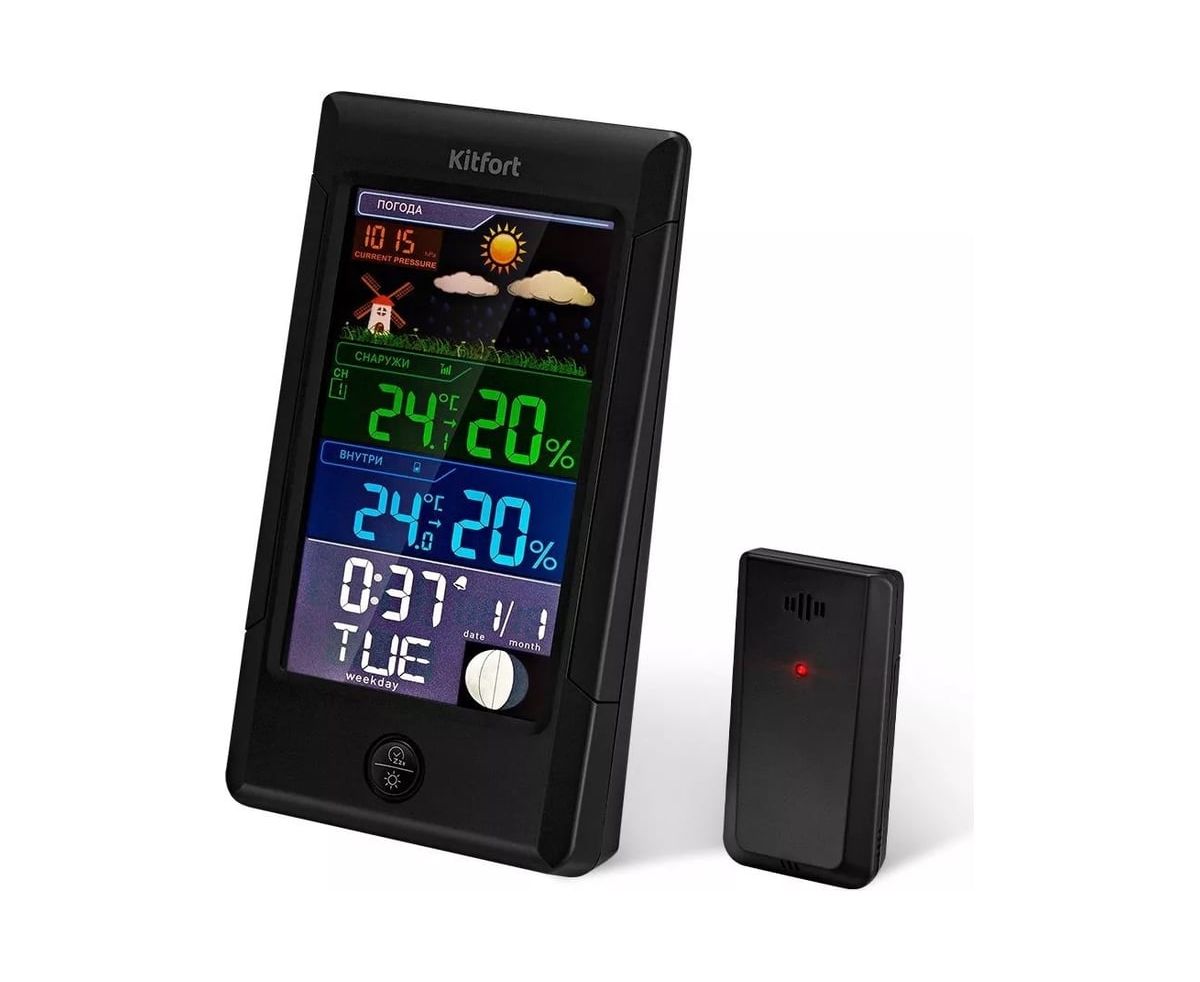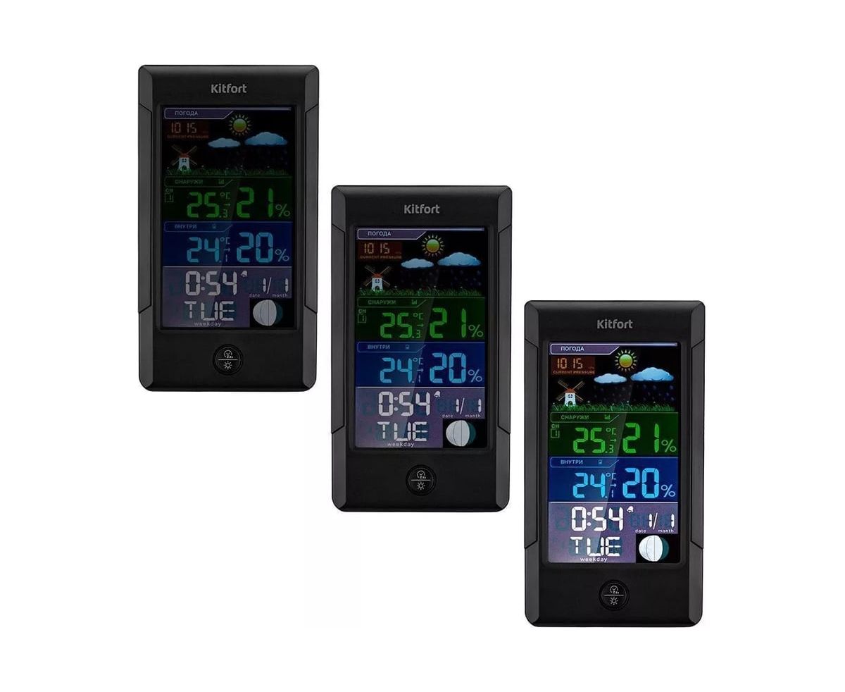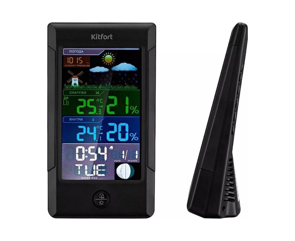 Метеостанция KITFORT КТ-3322 позволит следить за показаниями t и влажности в помещении и на улице, фазой луны, погодой, атмосферным давлением. Устройство прогнозирует погодные условия на ближайшие 12–24 ч на основе изменения атмосферного давления.
