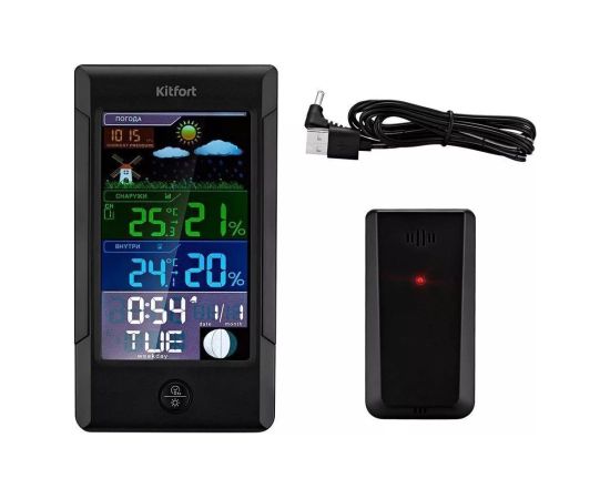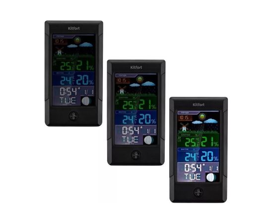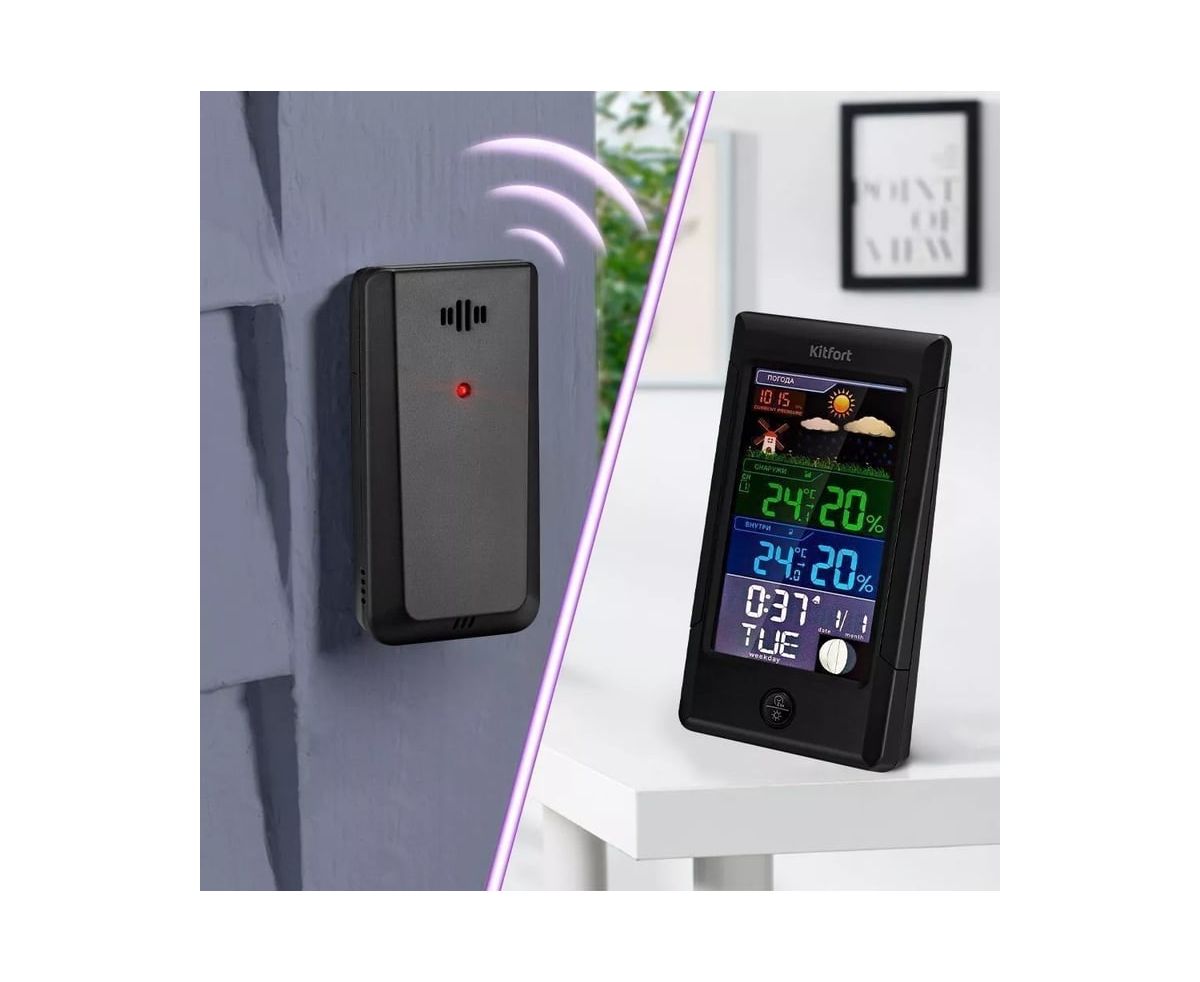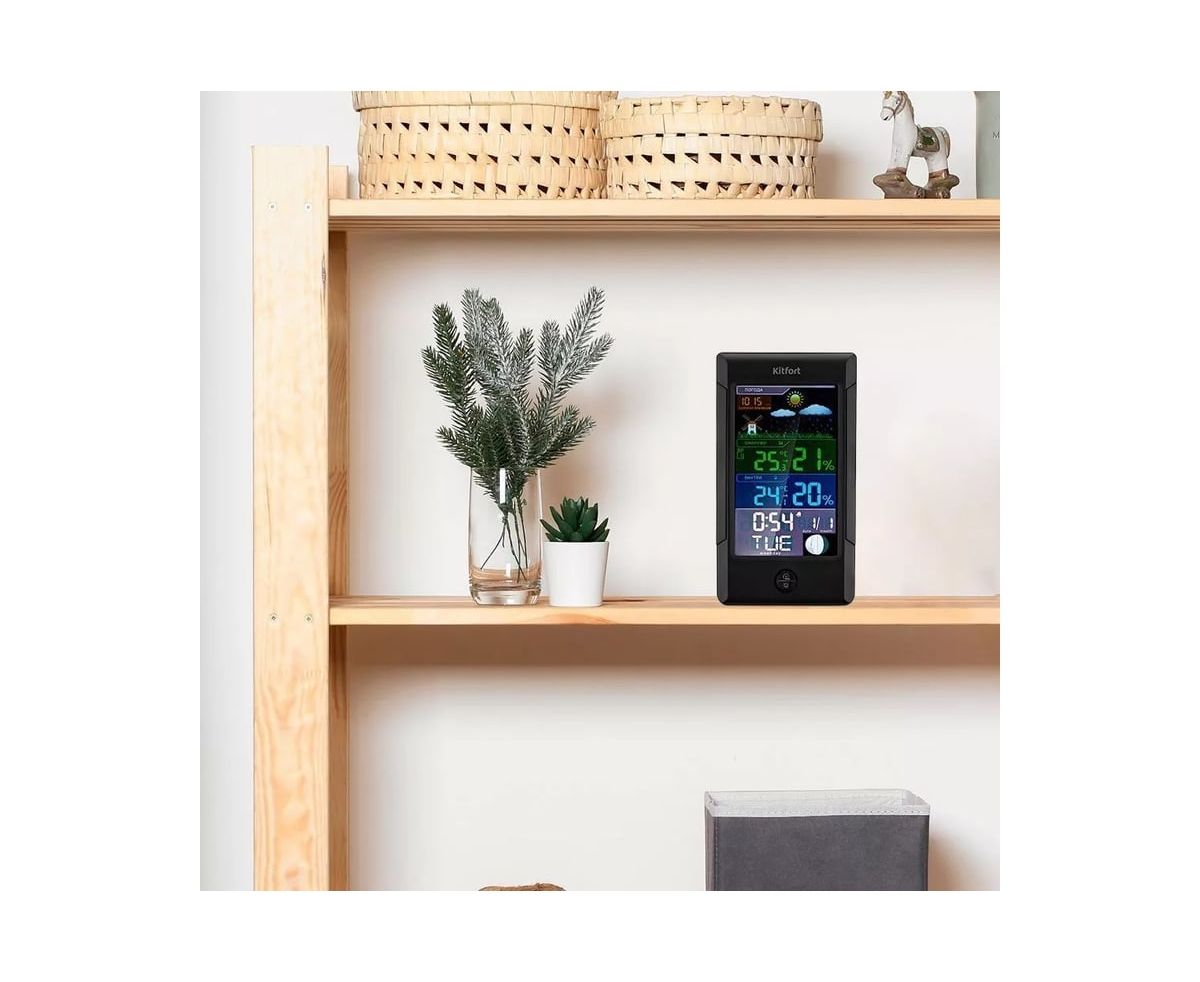 Метеостанция KITFORT КТ-3322 позволит следить за показаниями t и влажности в помещении и на улице, фазой луны, погодой, атмосферным давлением. Устройство прогнозирует погодные условия на ближайшие 12–24 ч на основе изменения атмосферного давления.