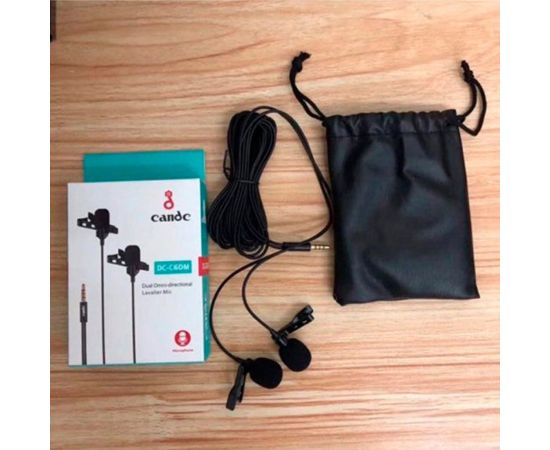 Петличные микрофоны Candc DC-C6DM двух направленные петличные микрофоны на одном проводе, которые подходят для записи звука при съемке видео и предназначенные для использования с DSLR камерами, видеокамерами т.д. Имеют зону охвата в 360 градусов. Интегрированный 6-метровый кабель с 3.5мм, 4-контактным штекером, можно подключать непосредственно к большинству камер. Микрофоны поставляются с клипсой, для крепления к верхней одежде. Длина кабеля 6 метров, подходит на все случаи записи и удобен во время работы с любыми устройствами. Для блокировки посторонних голосов, шума улицы и других нежелательных звуков у микрофона есть защита из вспененного материала. Также, в комплектации идет специальный чехол-мешочек из мягкой ткани, поэтому микрофон будет удобно хранить и транспортировать.