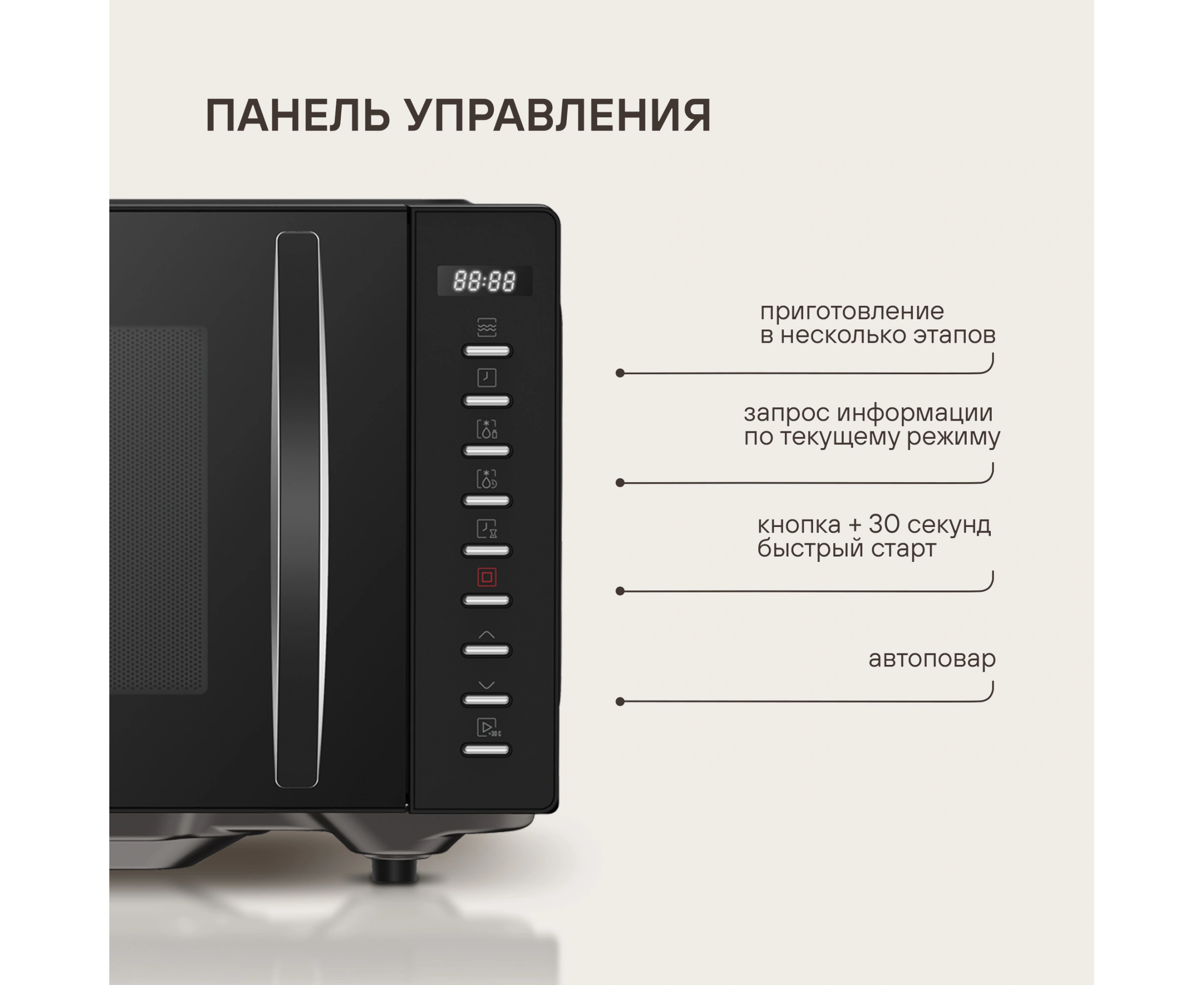 быстрый старт, звуковой сигнал окончания приготовления, кнопка +30 секунд, пауза, регулировка мощности