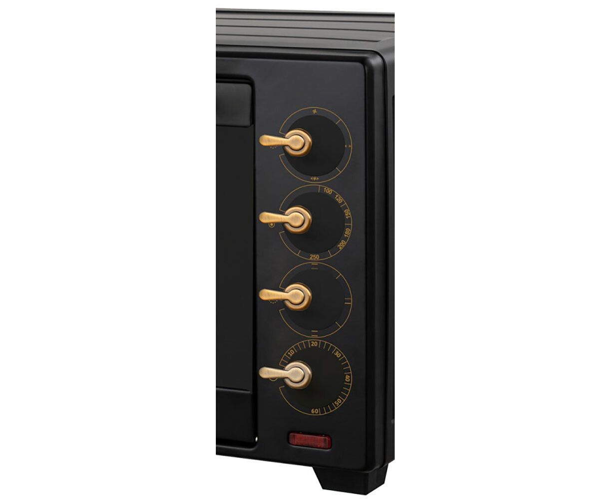 электропечь, металлическая решетка, плоский противень, ухват для противня, круглый противень для пиццы, вертел для гриля, ухват для вертела, насадка для приготовления шашлыка/кебаба, поддон для крошек, гарантийный талон, инструкция на русском языке
