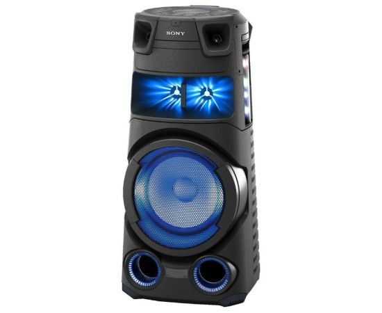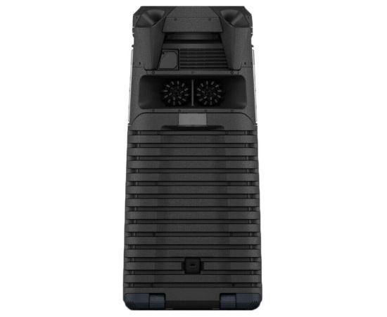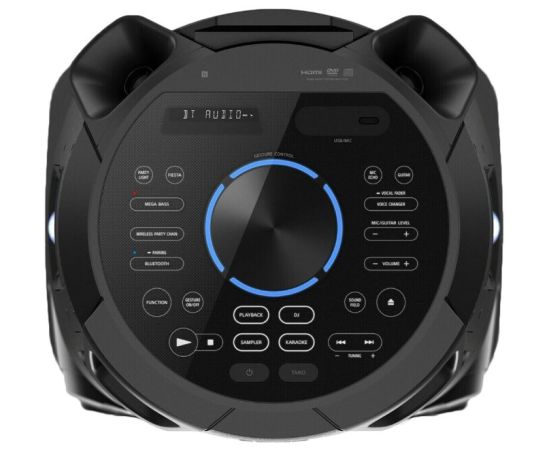 Дополнительная информация: NFC, A2DP, AVRCP; зарядка гаджетов от устройства; функция Mega Bass, технология цифрового улучшения звука DSEE, беспроводное подключение по Bluetooth с функцией Party Chain, ClearAudio+, блокировка от детей, замок лотка, колеса; высокочастотный динамик на задней панели; функции Karaoke: уменьшение громкости голоса на записи, изменение тональности, очки, громкость микрофонам, Echo (Эхо), Бэк вокал, изменение голоса; подсветка динамика, лазерное шоу; пульт ду; управление жестами; защита от брызг для верхней панели