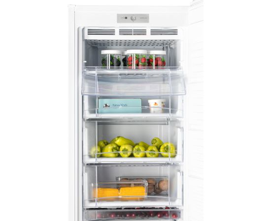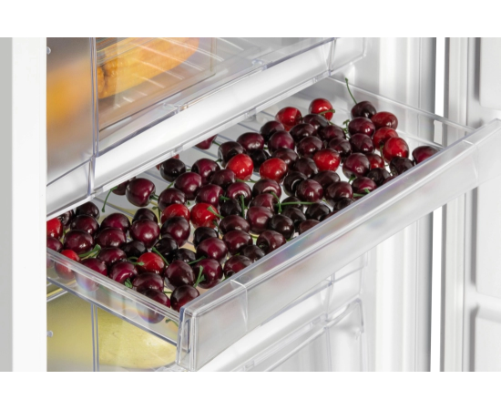 Морозильник имеет 8 секций для размещения продуктов: 6 выдвижных прозрачных ящиков и 1 отделение с откидной шторкой, лоток для ягод и форму для льда. Внутренняя поверхность модели имеет антибактериальное покрытие, которое предотвращает появление неприятных запахов и образование бактерий.