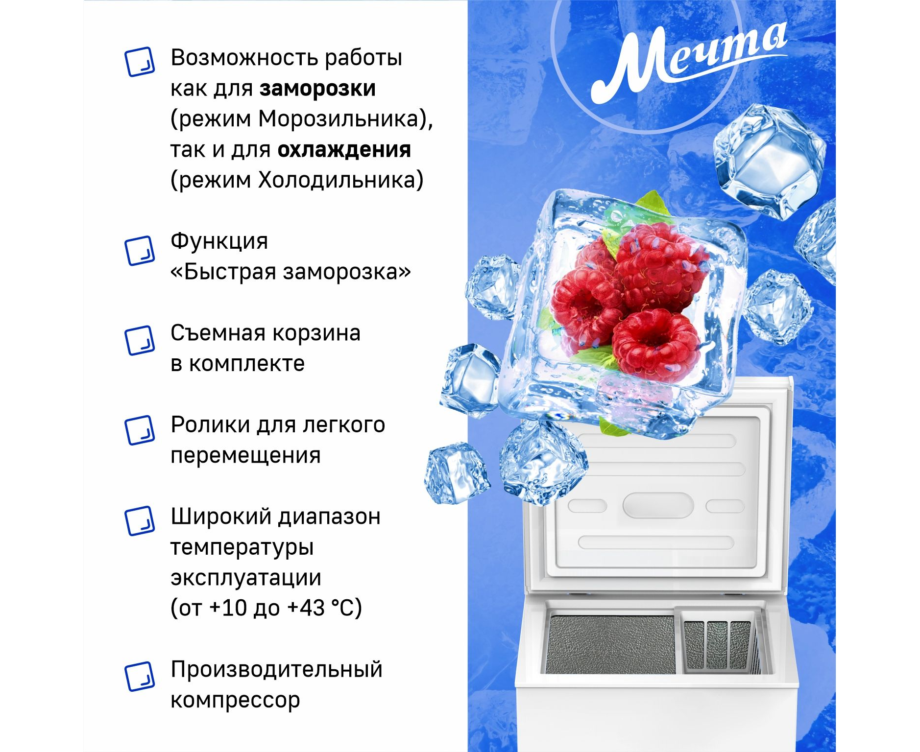 Комплектация: морозильная камера, съемная корзина, руководство по эксплуатации