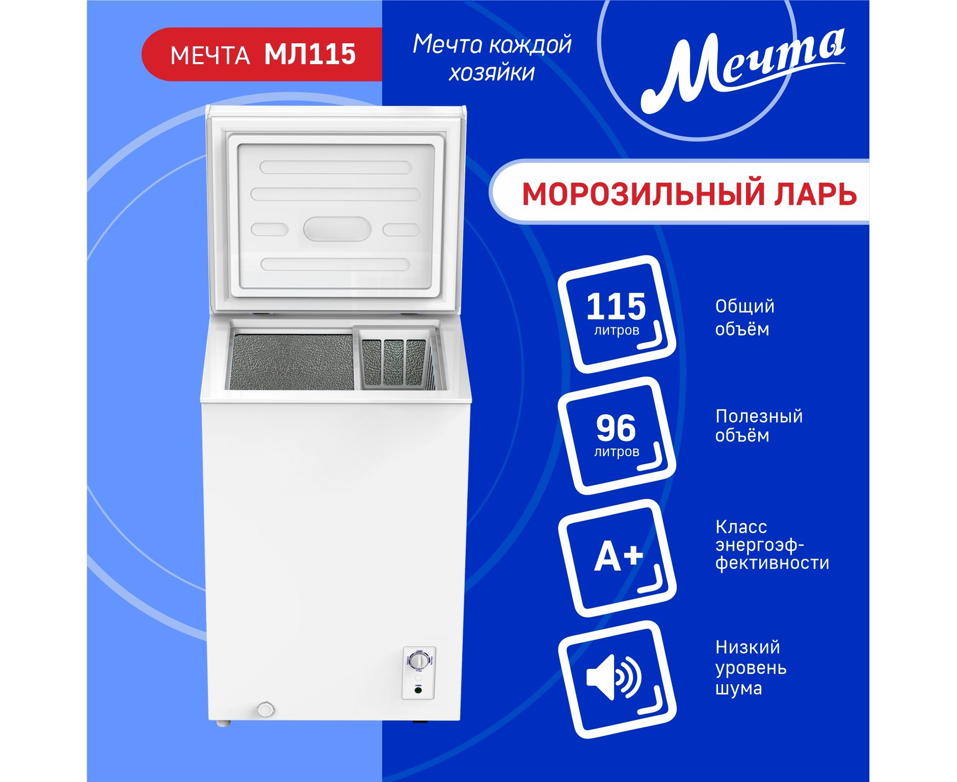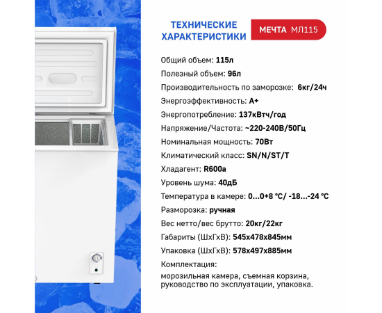 Морозильный ларь мечта МЛ-115 имеет общий объем 115 л, полезный объем 96 л; производительность при заморозке 6 кг/24 часа, энергоэффективность А+, энергопотребление 137 кВтч/год, номинальная мощность 70 Вт, климатический класс SN/ N/ ST/ T; хладогент R600а, уровень шума 40 дБ, температура в камере 0…0+8/ -18…-24 градусов.