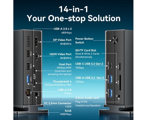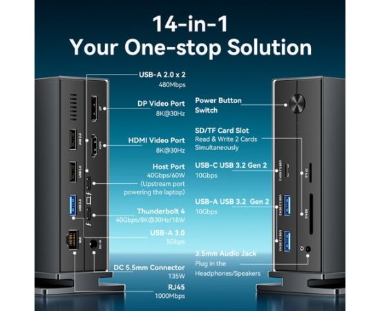 Поддержка: HDMI v2.1/DP1.4 (8K@30Гц)+3D; USB 3.2 Gen 2-C ; USB 2.0 ; USB 3.0 ; CTIA ; Gigabit Ethernet ; 2.0 SD 1-LUN ; Thunderbolt 4