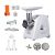 мощность 1500Вт, производительность 1.7кг/мин; количество скоростей 1; реверс; насадка для колбас; насадка для кеббе; насадка для соков; насадка-терка; насадка для шинковки; материал лотка пластик; цвет белый