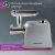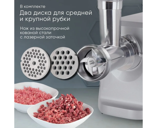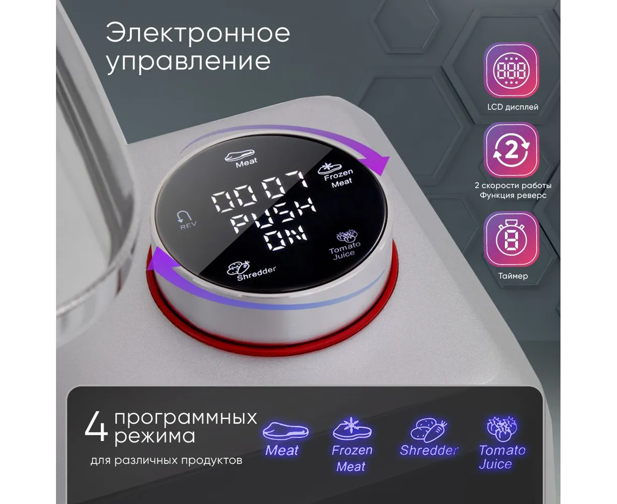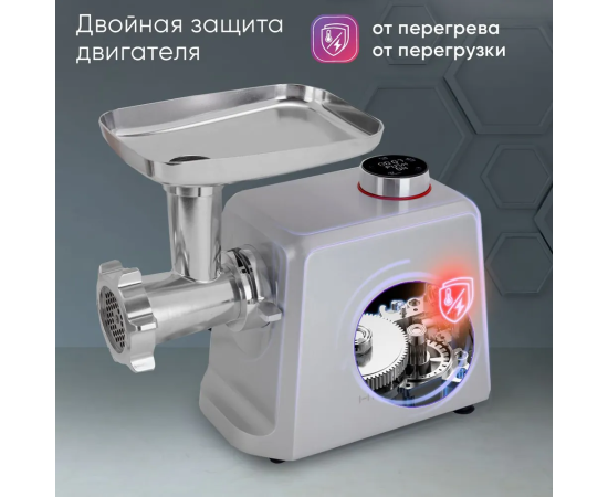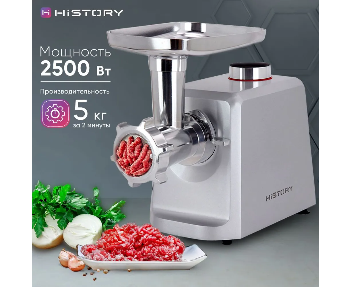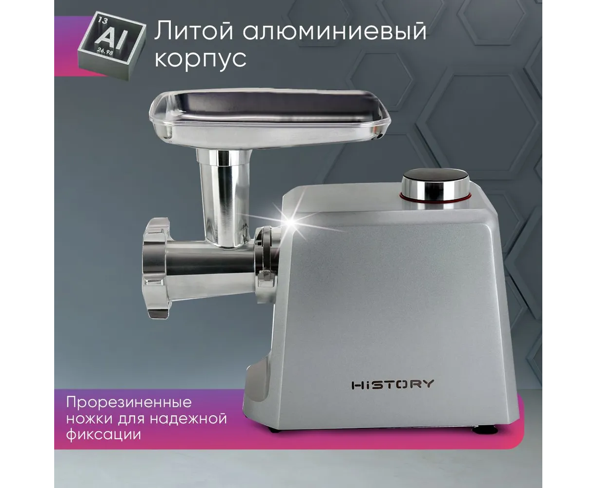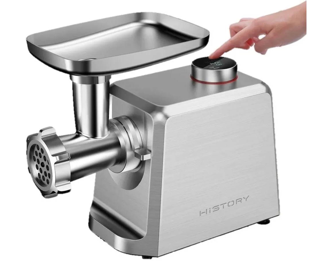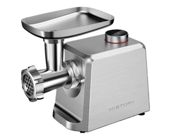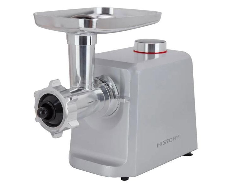 Электромясорубка HiSTORY IMG-XD420, серебристая, оснащена дисплеем с электронным управлением, который отображает время работы, две скорости и четыре режима работы. В наличии световые и звуковые индикаторы включения и работы. Корпус и комплектующие изготовлены из литого алюминия. Мотор мощностью 2000 Вт обеспечивает производительность до 2,5 кг/мин. Он защищен от перегревания и перегрузки. При попадании с отсек твердого предмета устройство автоматически выключится. Максимальный уровень шума — 80 дБ.