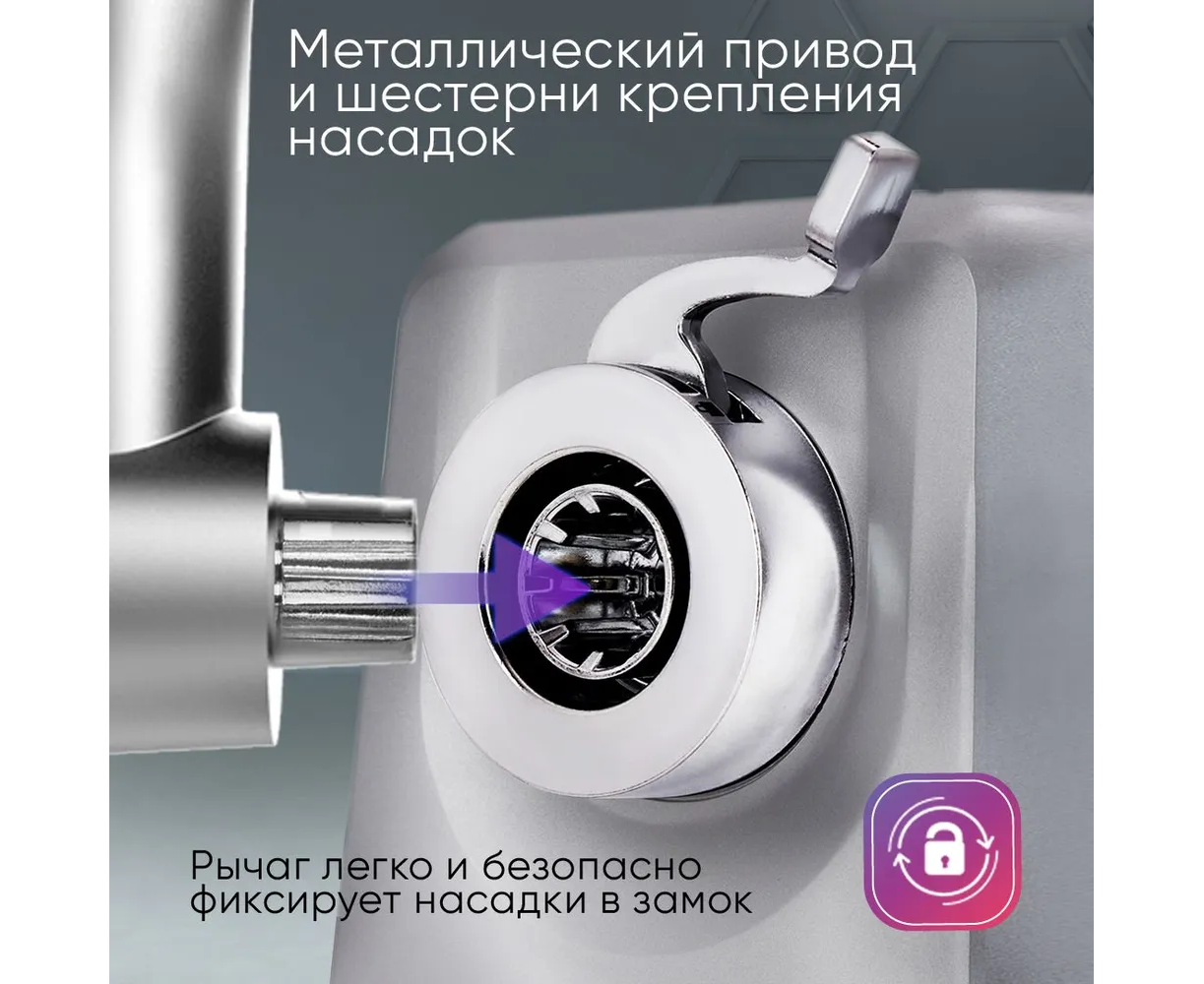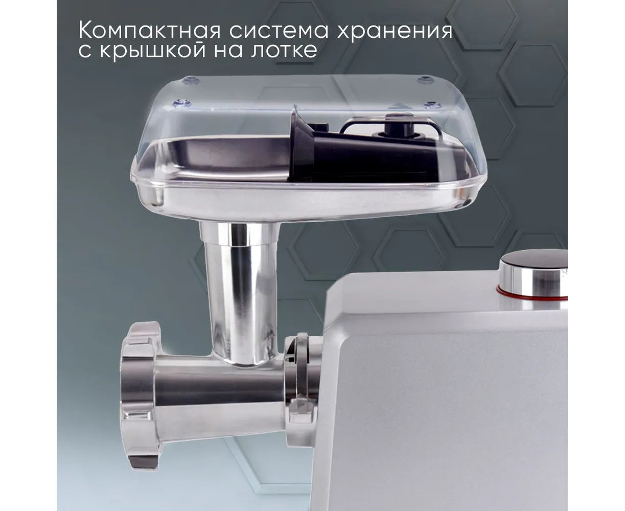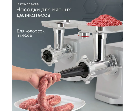 Для безопасности использования предусмотрен фиксатор насадок. В комплект входят: стальной самозатачивающийся нож, толкатель, две насадки — для кеббе и сосисок. В лотке оборудована система хранения комплектующих. Устойчивость и защиту поверхности от царапин обеспечивают ножки-присоски. Параметры модели: вес — 4,05 кг, габариты — 33,5х36,5х17 см. Прибор питается от сети 220-240 В, относится к I классу защиты от поражения электрическим током.