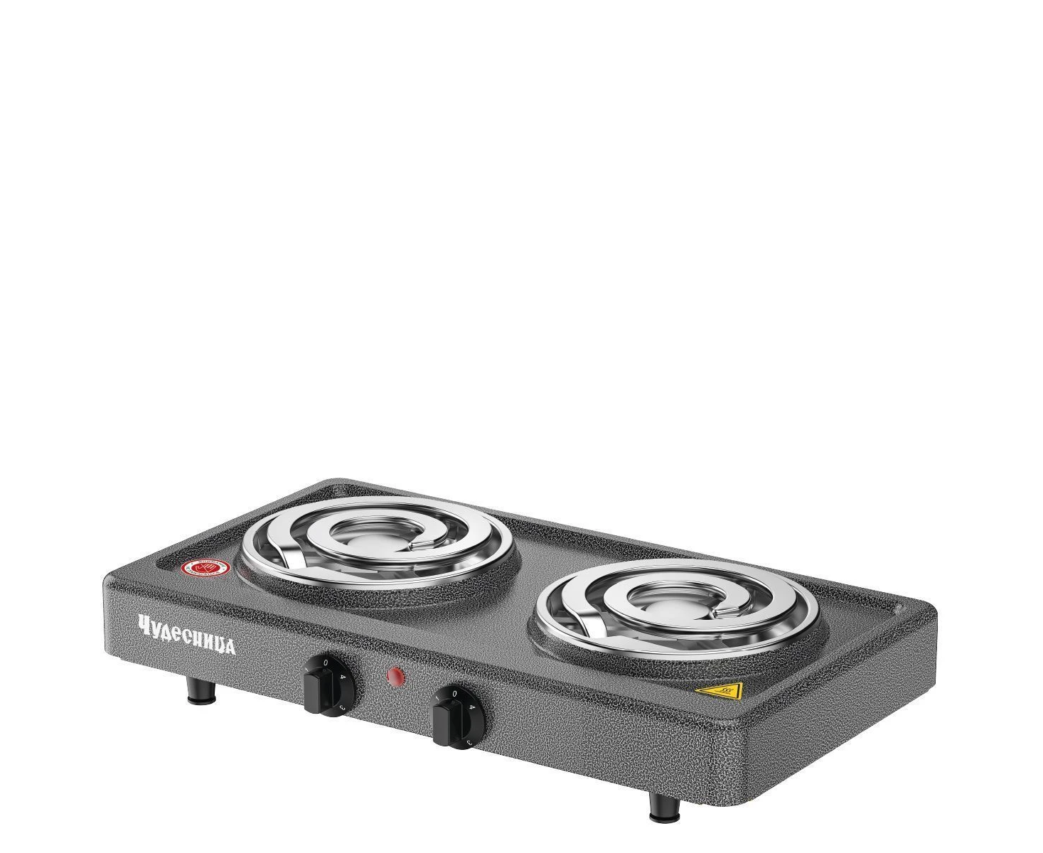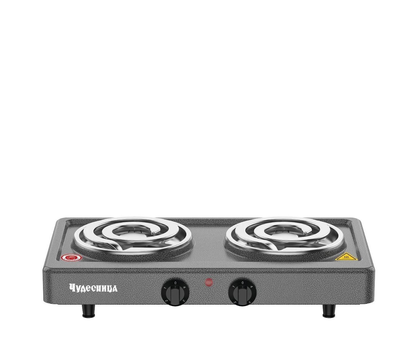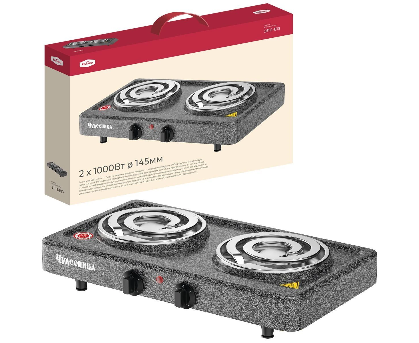 Плитка электрическая Чудесница ЭЛП-813 с 2-мя конфорками, цвет черный, мощность 1000+1000 Вт, толстый спиральный нагревательный элемент из высококачественной стали, плавная регулировка температуры, прочное легкоочищаемое термостойкое эмалевое покрытие, защита от перегрева, световой индикатор работы