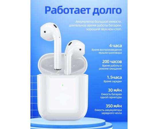 Емкость аккумулятора: 350 мАч (зарядный чехол); 30mAh (левая и правая гарнитура)