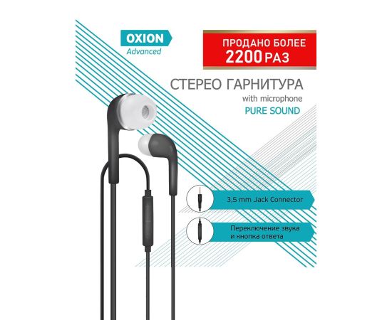 Наушники с микрофоном OXION HS230BK (Затычки, 20-20kHz, не меньше 100dB, 16 Ом, шнур 1 м). Проводная стерео гарнитура. Производитель: Oxion.
