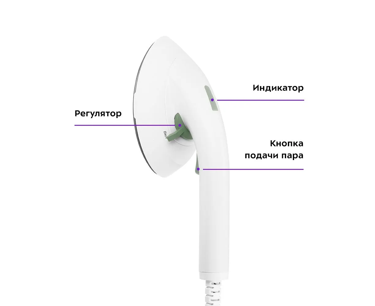 Чтобы включить нагрев утюжка, поверните регулятор справа налево до упора. Загорится индикатор. Когда прибор достигнет нужной температуры для подачи пара, индикатор погаснет. Чтобы включить подачу пара, нажмите и удерживайте кнопку подачи пара.