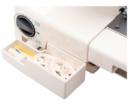 запасной верхний нож, катушечные колпачки, ключ шестигранник, масленка, мусоросборник, набор игл, отвертка, пинцет, сетка, щеточка