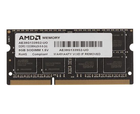 ОЗУ AMD 8GB Radeon DDR3 1333 SO DIMM R338G1339S2S-UO Non-ECC, CL9, 1.5V, Black, Bulk