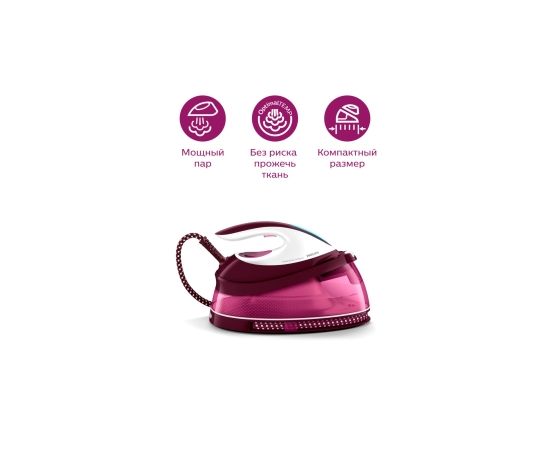 Благодаря мощной постоянной подаче пара обеспечивается быстрое глажение, а наша технология OptimalTEMP избавляет от необходимости регулировки температуры. Компактная конструкция и небольшой вес для простого использования и хранения. Прозрачный резервуар объемом 1,5 литра обеспечивает 1,5 часа непрерывного использования. Вам будет хорошо видно, сколько воды осталось в резервуаре, а благодаря широкому отверстию вы сможете легко наполнять его под краном. Надежная фиксация утюга на базовой станции для удобной переноски и сокращения риска случайного прикосновения к горячей подошве. Встроенная система Smart Calc-Clean напомнит о необходимости очистки от накипи. Теперь для очистки от накипи не нужно покупать дополнительные картриджи благодаря специальному контейнеру в комплекте. Наша особая подошва SteamGlide с антипригарным и устойчивым к царапинам покрытием легко скользит по любой ткани. Ее также легко очищать.