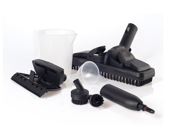 Принадлежности в комплекте: составная удлинительная трубка, тряпка для пола, скребок для стекла, круглая нейлоновая щетка маленькая, круглая нейлоновая щетка большая, мерная чашка, воронка